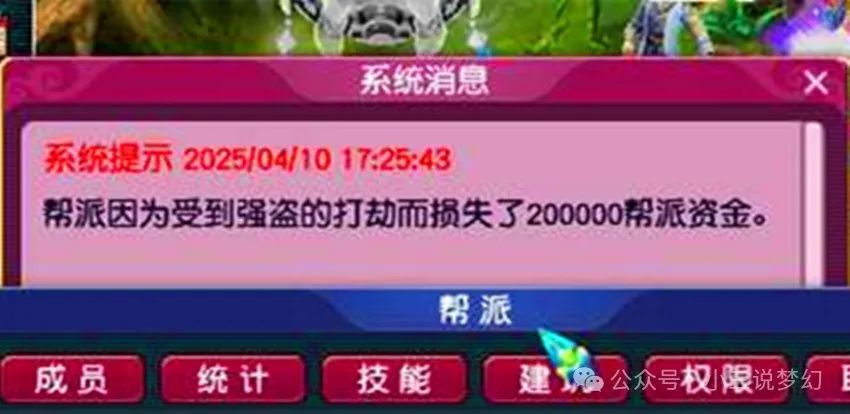 看到上面的系统消息了吗?上面的这条系统消息就意味着上面这位玩家的帮派碰到了帮派强盗的特殊事件后没有在规定的时间内全部都清理掉,所以帮派资金受到了损失,像上面的这种情况有可能是该帮派中五开玩家比较多导致的,然后触发帮派强盗的时候五开,要么是没有上线,要么是正在刷其他的任务,都没有回来杀帮派强盗,所以才会出现这种处罚情况呢,其实帮派强盗给的奖励还是比较不错的,各位玩家的队伍完全可以一个回合完成战斗,完成战斗以后给的奖励能够达到1万左右,而且还会给宝图呢