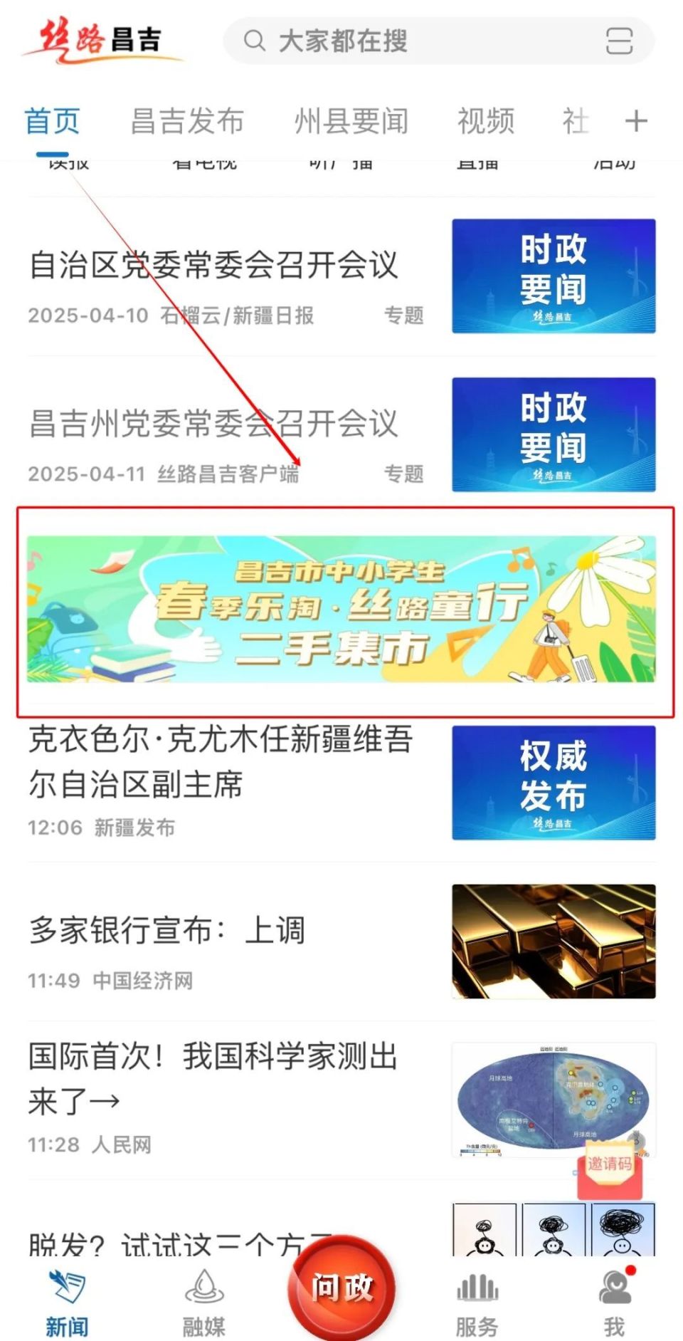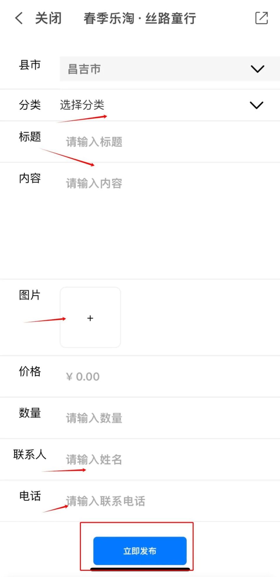 第二步:打开丝路昌吉客户端“首页”→下滑进入“春季乐淘·丝路童行二手集市”页面→点击页面底部“+”,填写需要销售的二手物品信息→点击“立即发布”。