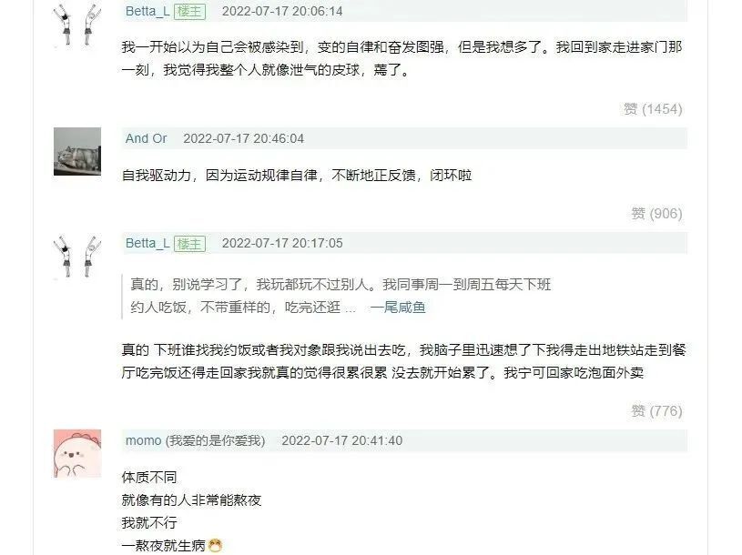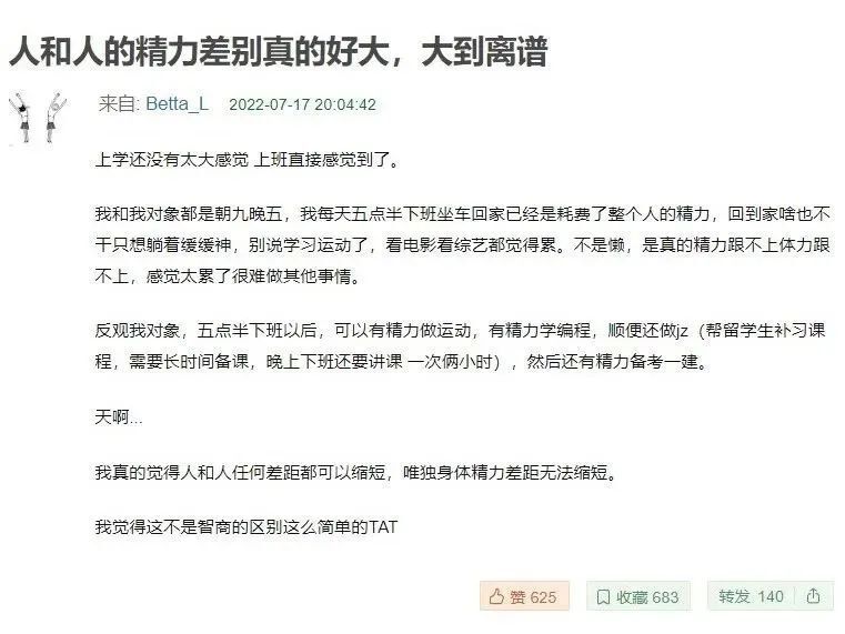 在这些差距当中,运动量的分别更是离谱,精力好的人可以每天锻炼一两个小时,精力差的勉强支撑到下班回家就一躺难起了。