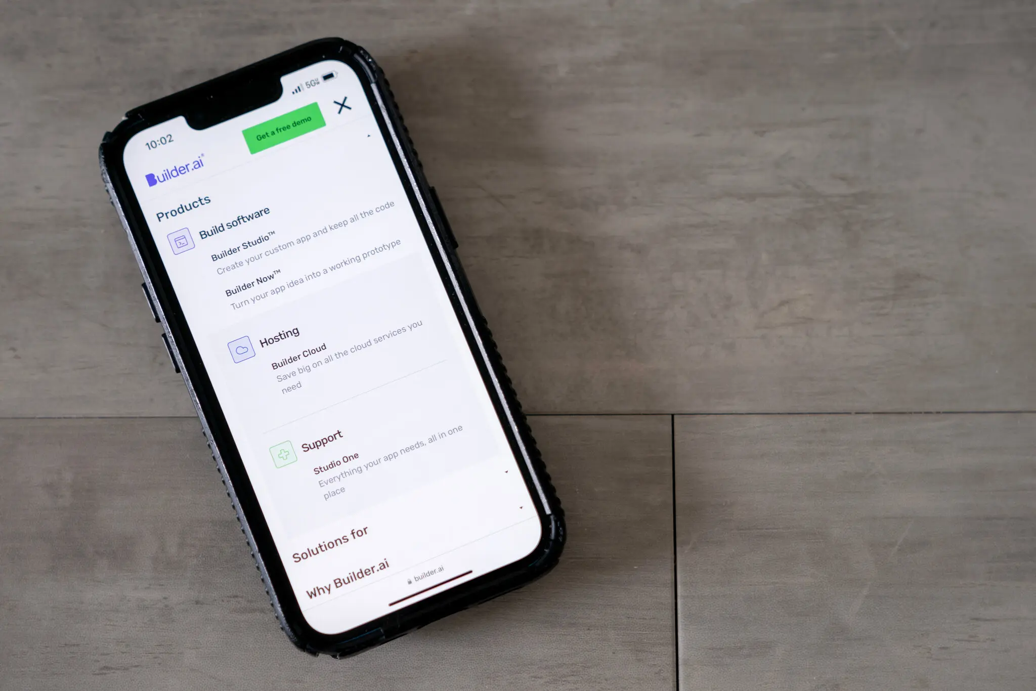 智能手机屏幕上显示着Builder.ai的网站,其营销口号是“让构建网站或应用程序变得像点披萨一样简单”