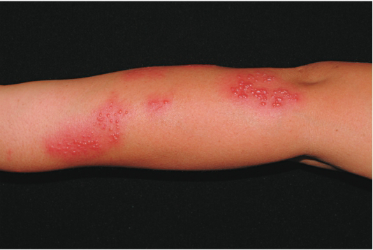 表现:一侧身体沿某条线长出成片红疹、水疱。皮肤感觉烧灼、刺痛或者剧烈疼痛,像电击一样,轻微触摸也会引起明显疼痛。