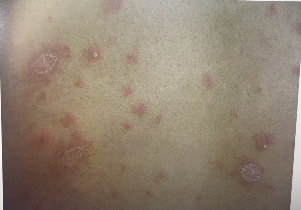 表现:环状或者半环状的红斑鳞屑,边界清晰,并常伴有不同程度的瘙痒感。