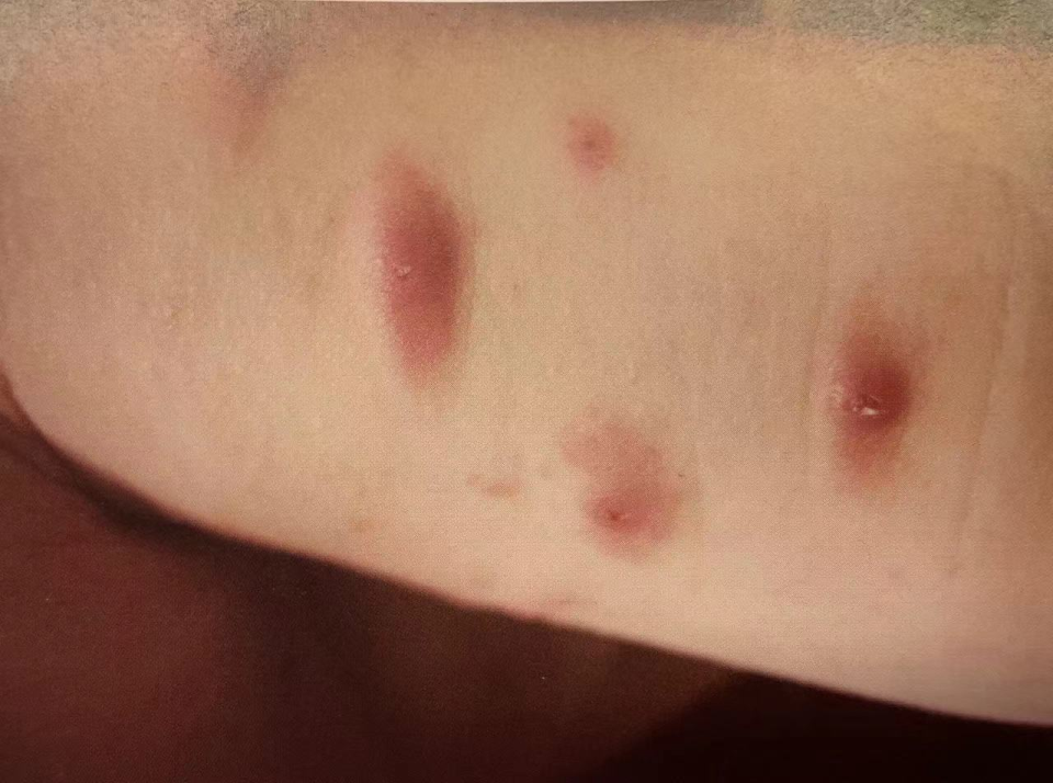 表现:皮肤会先感觉痒,之后起红色突起的疙瘩,中央常有叮咬痕迹(小瘀点或水疱),成片或成簇分布,消退相对较慢,需要数天甚至数周。