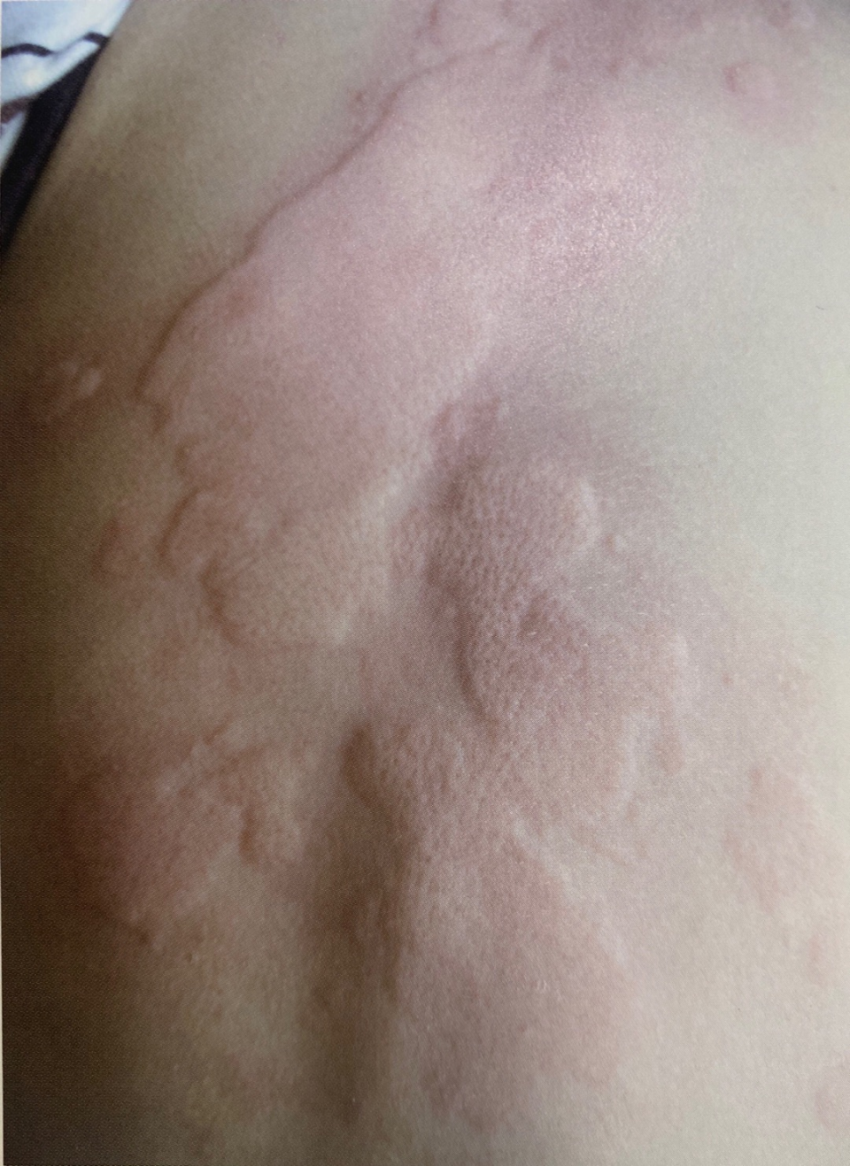 表现:会出现大小不一、形态不规则的像蚊子咬过的大片红包(风团),痒得钻心。来得快去得也快,单个风团一般在 24 小时内会消退。但是可能会此起彼伏反复发作。