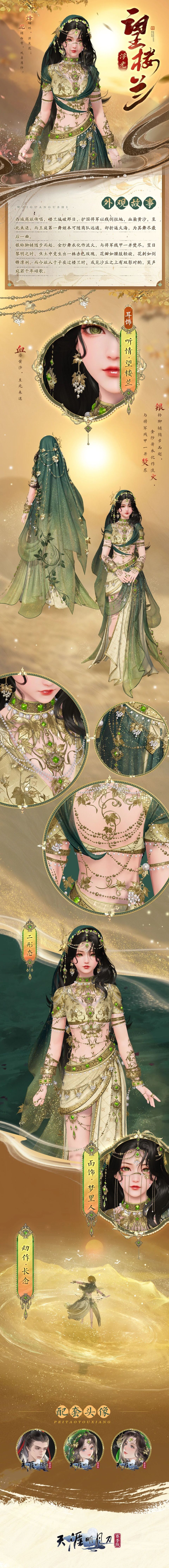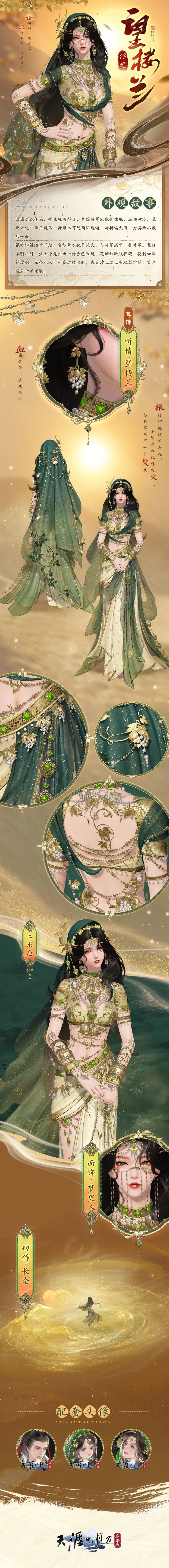 外观分为双形态,收藏外观同步解锁配套耳饰【听情·望楼兰】、面饰【梦里人】、动作【长念】与主题头像。