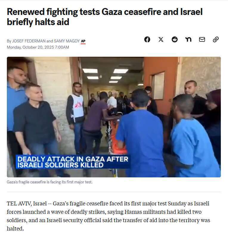 中国青年报客户端北京10月20日电(中青报·中青网记者 王梓)加沙停火仅仅数日,由美国主导的停火协议就遭遇考验。据《以色列时报》报道,以军10月19日对加沙地带南部拉法地区发动空袭“以消除威胁”,打击了数十个据称与哈马斯有关的目标。