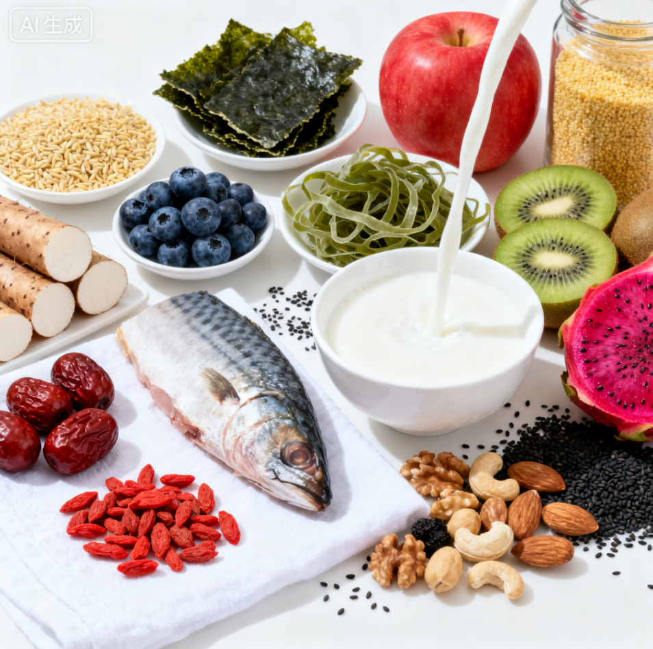 ▷有助抗衰老的美食:枸杞、山药、蓝莓、海带、海苔、裙带菜、小麦胚芽、红枣、海鱼、猕猴桃、苹果、红心火龙果、小米、黑芝麻、牛奶、坚果等。