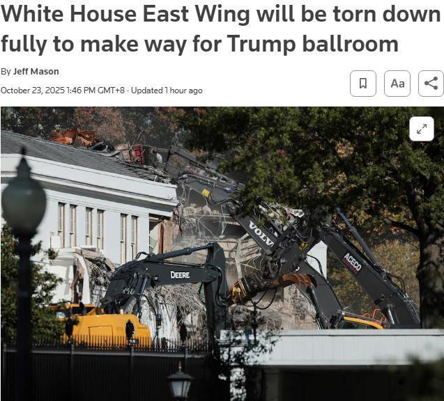 路透社指出,美国最具历史意义的建筑之一被部分拆除,引发众多民主党人的愤怒抗议,并质疑特朗普政府是否遵守了恰当的程序。白宫驳斥了这些批评,称其为“刻意制造的愤怒”。