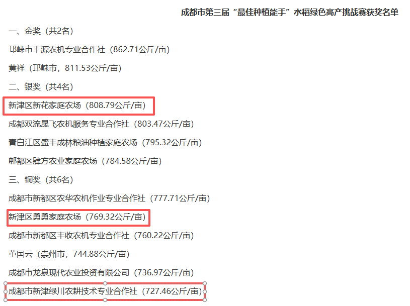 新津区勇勇家庭农场和新津绿川农耕技术专业合作社分别以亩产769.32公斤、727.46公斤荣获铜奖。