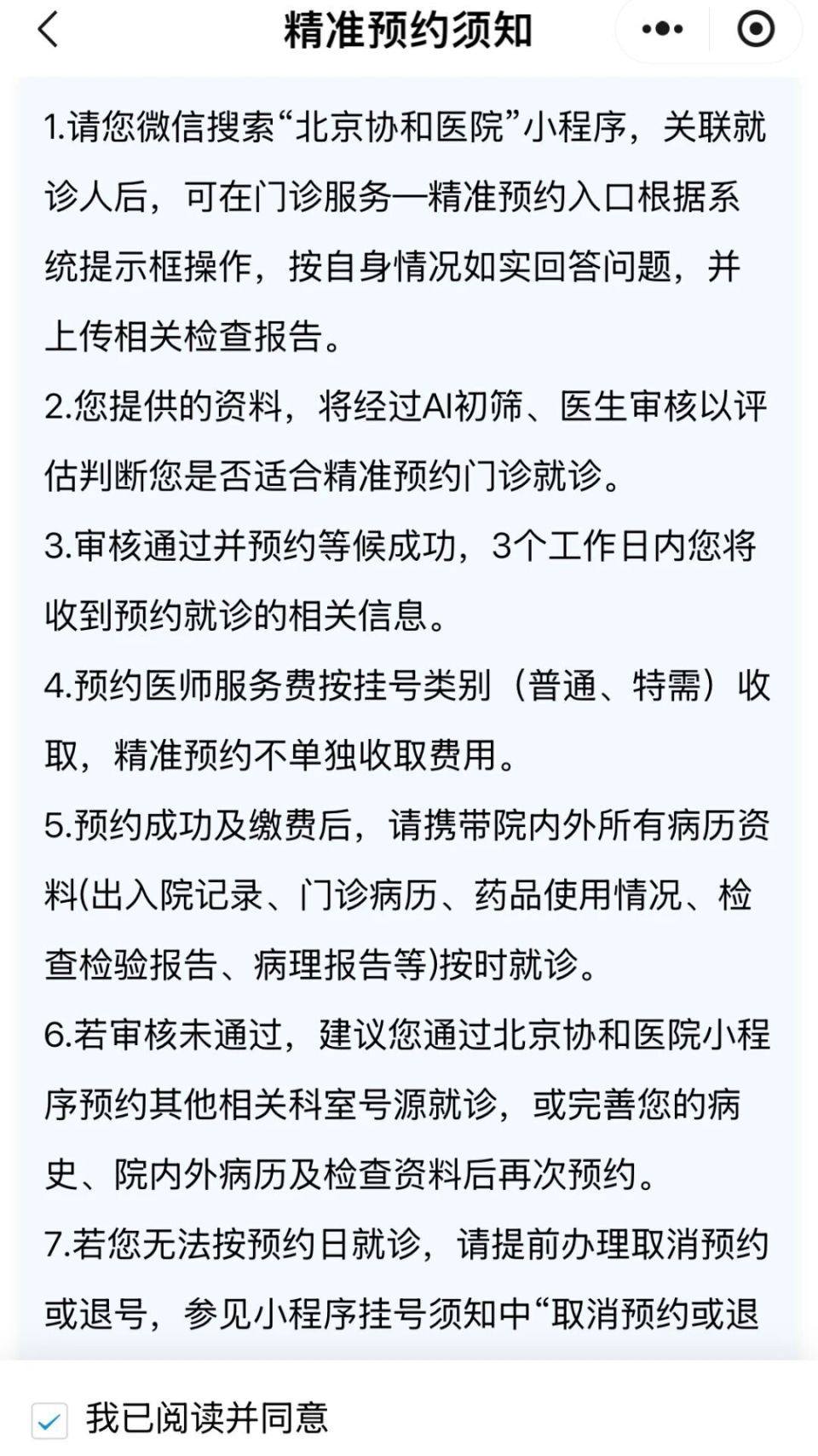 打开北京协和医院微信小程序,点击“挂号”,选择“精准预约”,仔细阅读精准预约须知后,就可在“医生列表”中选择想要预约的号源了。申请精准预约后,患者按自身情况回答问题,并上传相关检查报告。经过AI初筛、医生审核,符合要求的患者将在3个工作日内收到预约就诊的相关信息。如果审核不通过,申请状态中将显示“未通过”。
