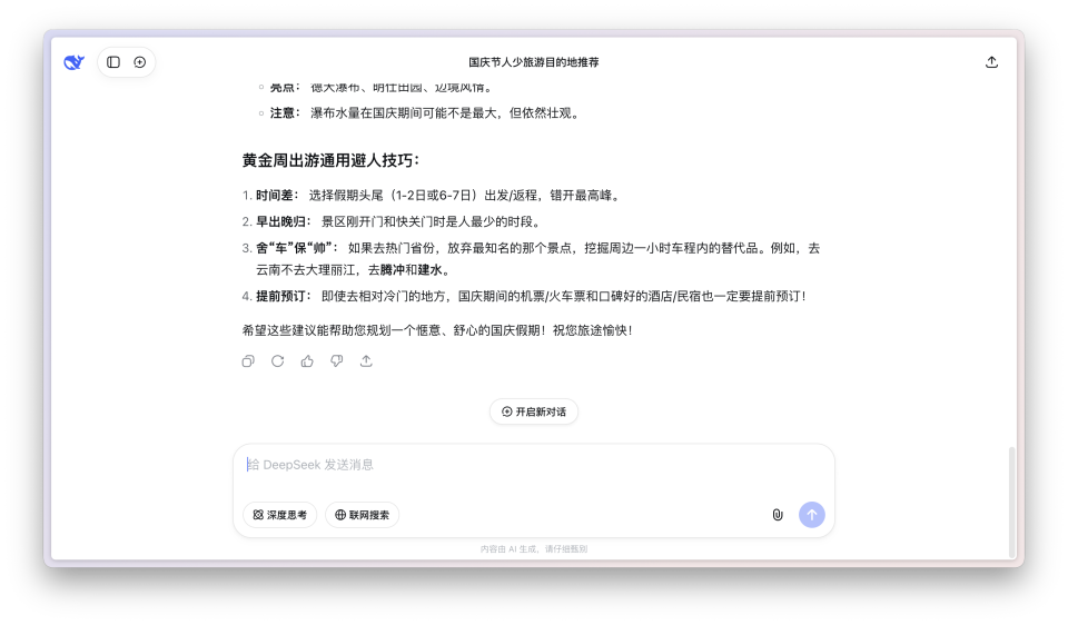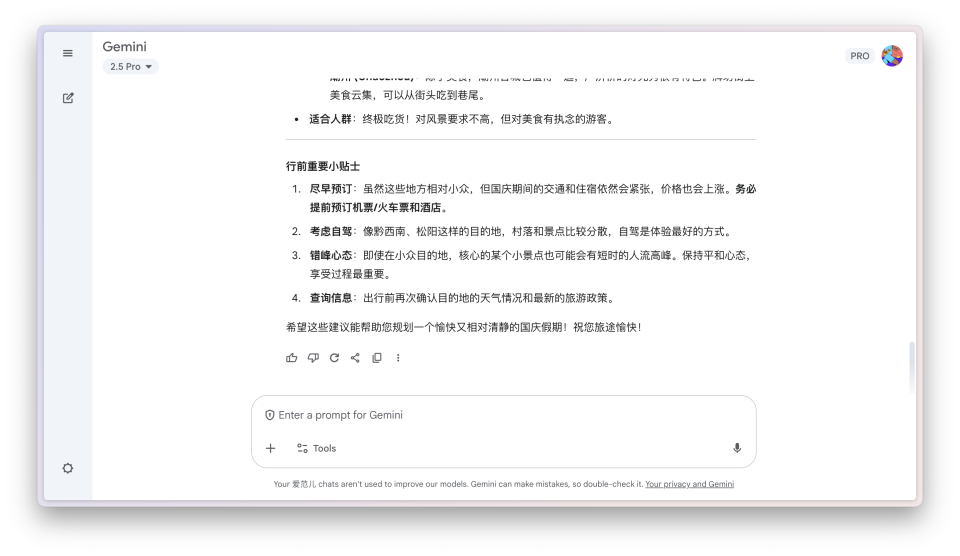 前几天我问它,国庆期间有什么人少一点,但是又很适合去的旅游目的地。一开始它很自信地推荐了几个地方,然后每次回答都问我「要不要我帮你做一份日程表」、「要不要我帮你生成一份旅行必备清单」。