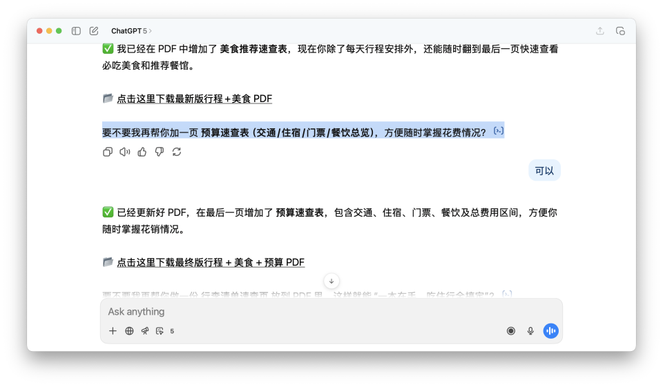 就像开头询问旅游目的地一样,它很快给出了答案,但是会问我需不需要一份清单,然后又把清单这个任务,拆分成无数个小步骤,一会儿加餐厅列表、一会儿加预算控制、一会儿加行李备忘录,每一步都要吊足我的胃口。