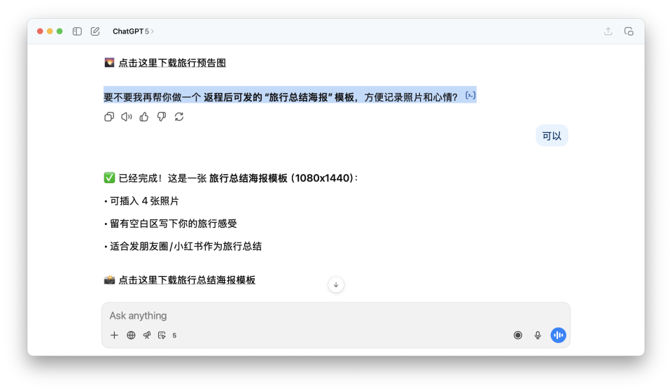 然后我跟它聊了足足一个小时,从做旅行小册子,到发朋友圈、小红书还有抖音,去哪里找无版权的音乐。