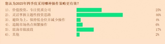 在市场操作策略方面,调查结果显示:46%的投顾建议投资者灵活掌握主题性投资思路,在各选项中占比最高,较上季度上升2个百分点;25%的投顾建议投资者选择价值投资,专注优质公司;17%的投顾认为宜视时机做波段,与上季度基本持平;4%的投顾建议投资者以避险为上,保持低仓位并减少操作。