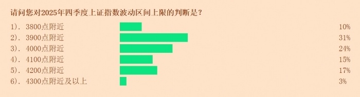 对于四季度上证综指的运行上限,受访投顾预测的点位主要集中在3900点和4000点。其中,31%的投顾判断指数的上限在3900点附近,24%的投顾预测上限在4000点附近。此外,分别有15%和17%的投顾预测,上限在4100点和4200点附近。