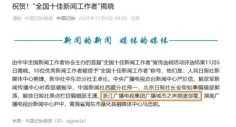 上周三,邹雯刚从2025中国广播电视精品创作大会上获评优秀广电新媒体代表,今天又荣获首届“全国十佳新闻工作者”称号,她感慨不已。