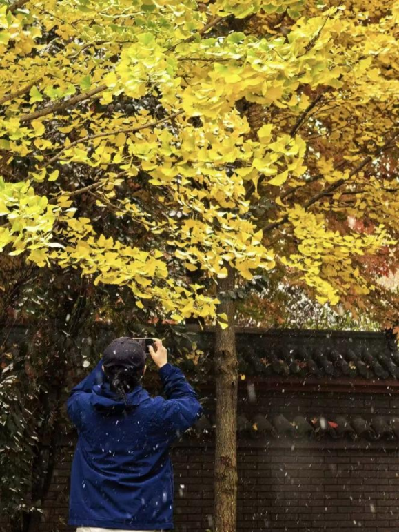 前几日清晨,秋意正浓。密集如絮的雪片,转瞬便给小区镀上银边。金黄的银杏叶和火红的枫叶还凝着秋阳的温度,转瞬被白雪轻拥,扇形和五角形叶片托着蓬松清雪,像缀满碎银的彩枝。我和妻子出门欣赏雪景,她站在树下拍风景,我觉得很好看,就拍下了这幅照片。