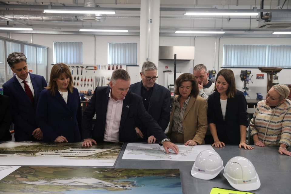 11月13日,英国首相斯塔默(左四)访问威尔士一个学院,宣布将在威尔士北部安格尔西岛上建设英国首个小型模块化核反应堆。图为斯塔默和英国财政大臣里夫斯(左二)等人在工程车间内交谈。 图源:外媒报道配图