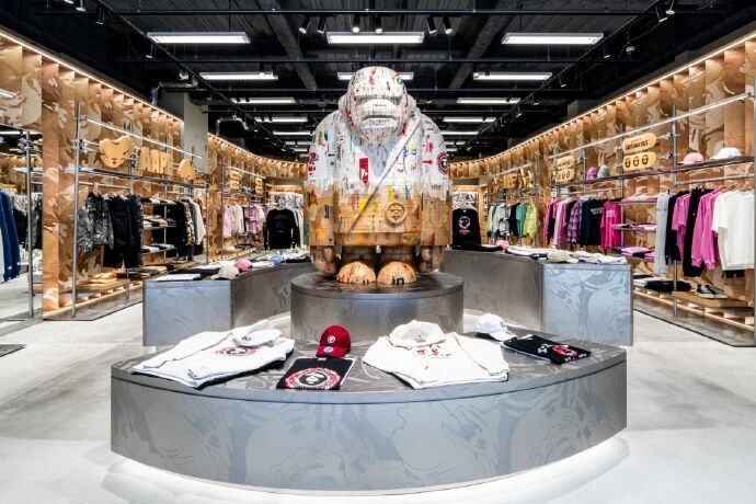 坐落于心斋桥的核心地带,AAPE全新专门店以2900平方英尺的零售空间,诠释未来主义与极简美学的完美融合。外立面覆饰特制的泡沫铝板,以金属光泽构建视觉焦点。门头的圆形半透明LED屏幕生动传递品牌动态视觉,为前来探访的顾客提供沉浸式的购物体验。