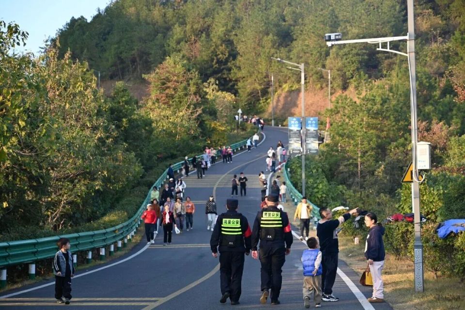 全力构建“地面巡防+智慧管控”立体化防控格局,安排警力驻守蟠龙峰、月亮湾、磨盘山公园、梅岭时光等景区景点,扎实开展高频巡防,快速疏导高峰客流,随时回应游客需求,守护景区秋韵盛景。