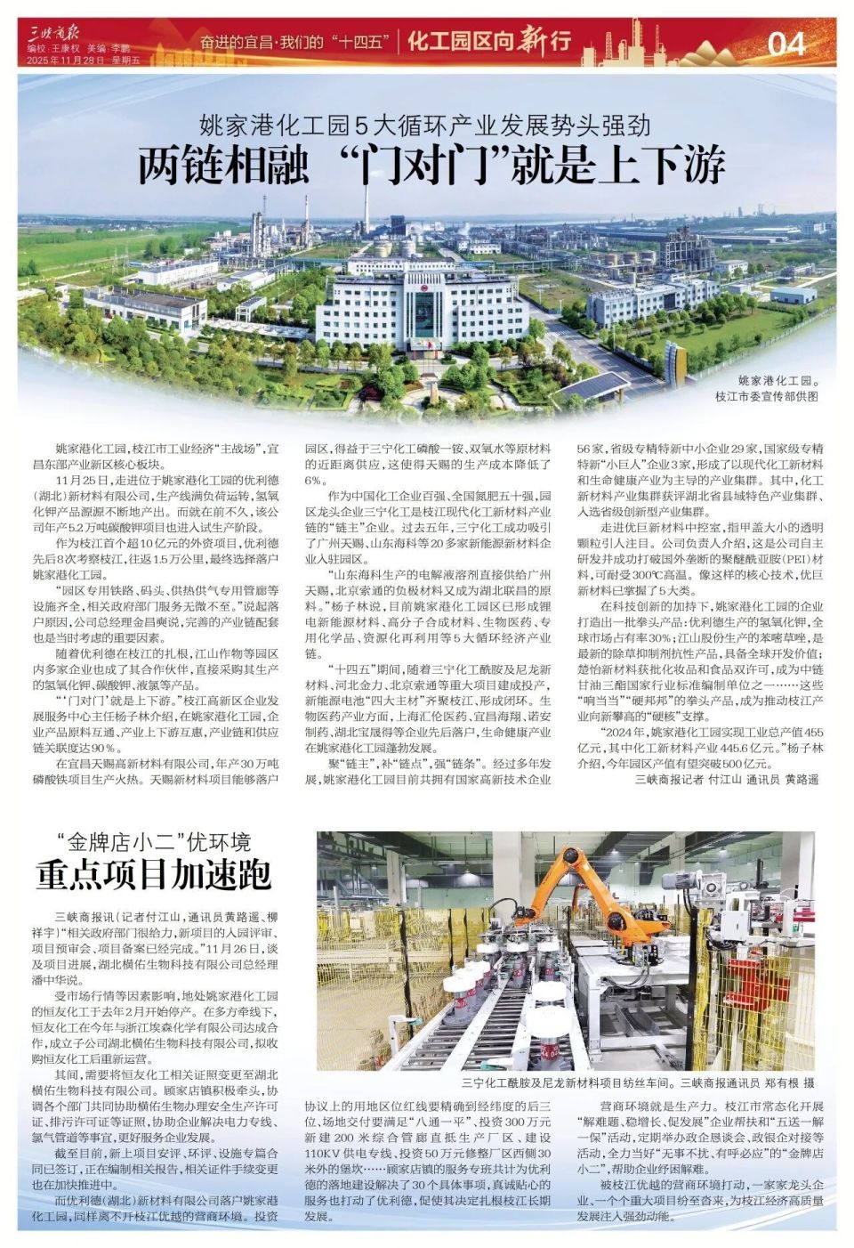 党的二十届四中全会明确提出“建设现代化产业体系,巩固壮大实体经济根基”。湖北徽阳新材料项目指挥部办公室主任靳心泉表示,项目以高端化工新材料为核心,着力构建“磷矿—精制磷酸—新能源材料”一体化全产业链闭环体系,推动当阳化工产业向绿色化、安全化、高端化全面升级。