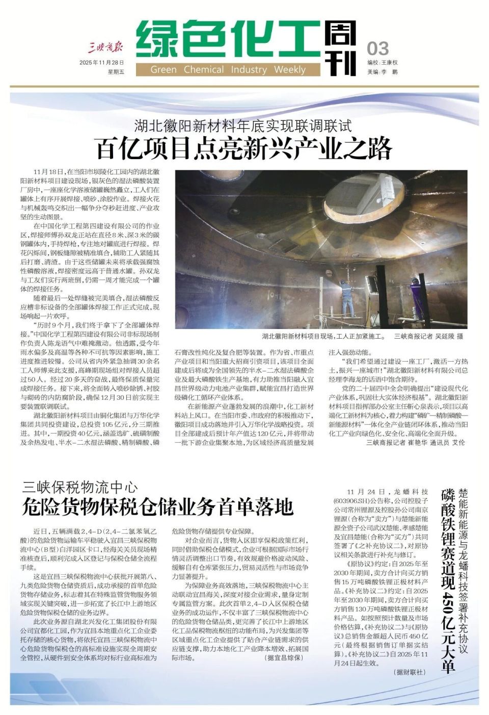 湖北徽阳新材料项目计划于年底实现联调联试,这个百亿投资项目将推动当阳化工产业升级,助力宜昌打造世界级磷化工和新能源材料基地。