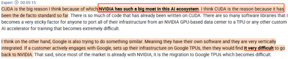 首先说一下国内外的一个通病,就是拉一踩一,最近谷歌链火了,在提谷歌的时候就非要踩一下英伟达。这是完全没有必要的,英伟达现在依然是绝对的老大,CUDA依然是很强的护城河。