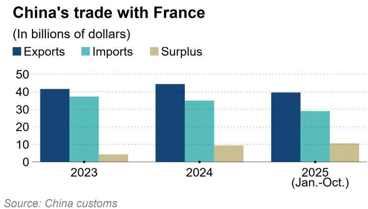 《日经亚洲》援引数据称,2025年前10个月,法国对华贸易逆差扩大至106亿美元,2024年全年为94亿美元。同时,双方贸易关系失衡严重。法国主要向中国出口乳制品、葡萄酒、化妆品和奢侈品,而中国则向法国出口电器、机械、家具以及越来越多的电动汽车。