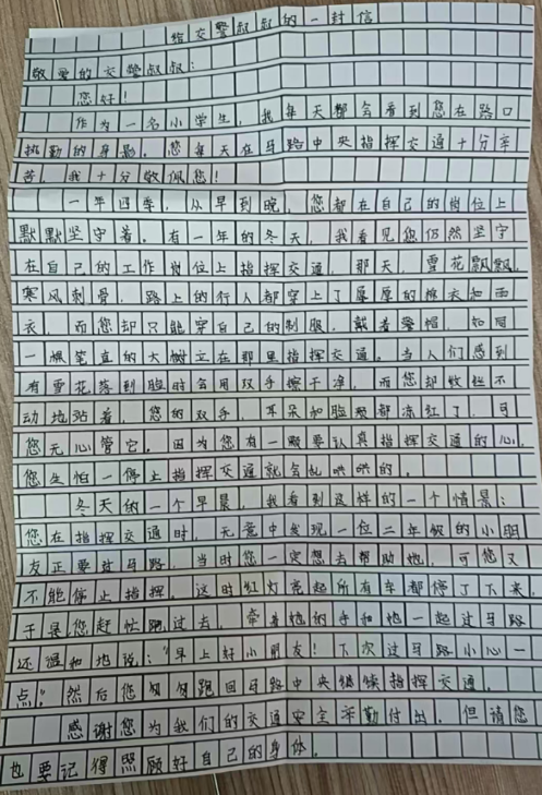 值得一提的是,这不是李兵收到的第一封感谢信。最近一个月,他已经收到了五封来自不同孩子的信。“您是我们上学路上最温暖的阳光。”稚嫩的字体、浅浅的笔迹、真诚温暖的话语,孩子们发自肺腑的敬意,不仅仅是一封感谢信,更是一颗颗纯真的童心对守护者的深情告白,让李兵心中涌动着暖流。