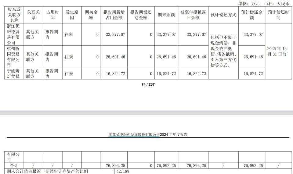 在2024年年报中,江苏吴中简单列示出其他关联方非经营相关占用资金情况——除了占用3.34亿元资金的优诺德外,杭州昕同国际贸易有限公司(以下简称杭州昕同)和宁波炘炘贸易有限公司(以下简称宁波炘炘)两家公司分别占用2.67亿元和1.68亿元,三家合计7.69亿元。