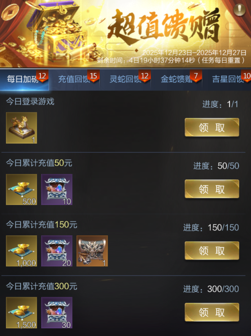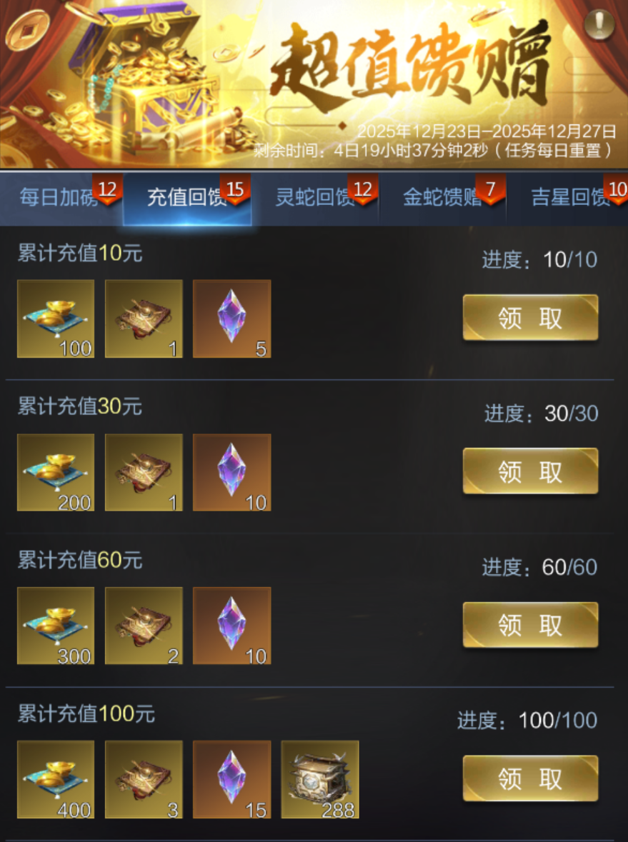 在金蛇吐珠消费后,还能在累充加磅领取多重返利。