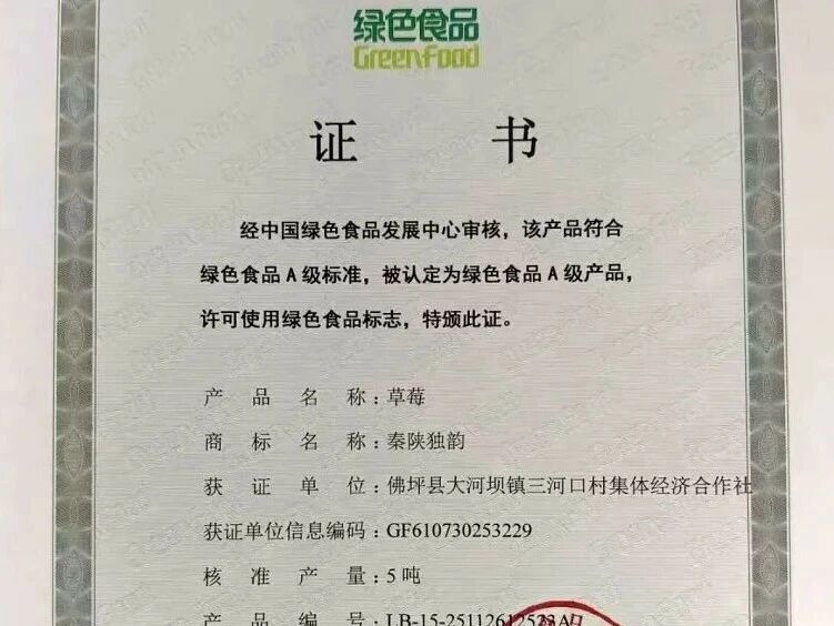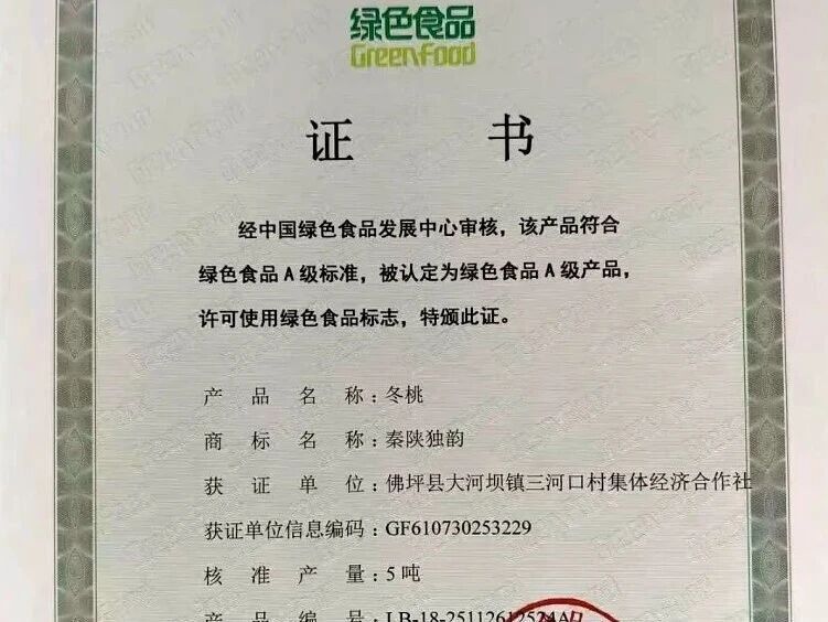 如今,一张张绿色食品认证证书,不仅是佛坪农产品的“品质身份证”,更成为了农民增收的“致富通行证”。