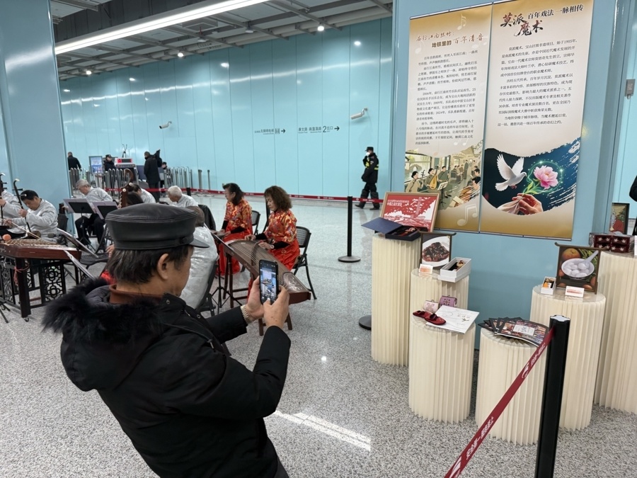 现场,庙行丝竹演出团队带着精心编排的经典曲目亮相,悠扬婉转的丝竹声在站内回荡。团队成员不仅现场演奏,还邀请市民加入互动,在乐师指导下尝试拨动古筝琴弦。尽管手法生疏,却赢得周围观众掌声连连。乐队成员还同步介绍庙行丝竹的发展历史,市民们围聚聆听,有人轻声跟唱,有人闭目陶醉,感受传统韵律的魅力。