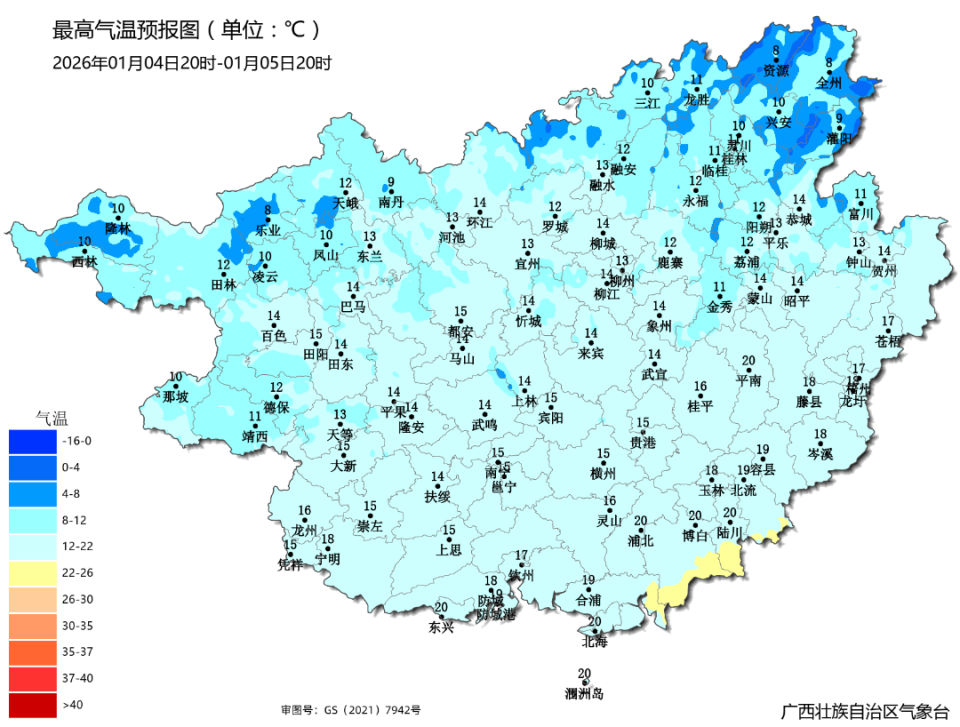 4日晚上到5日白天,桂北、桂西阴天部分地区有小雨,其它地区多云间晴、局地有小雨。高寒山区局地有冰冻或道路结冰。最低气温:高寒山区-2~4℃,桂东北4~9℃,其它地区9~13℃。
