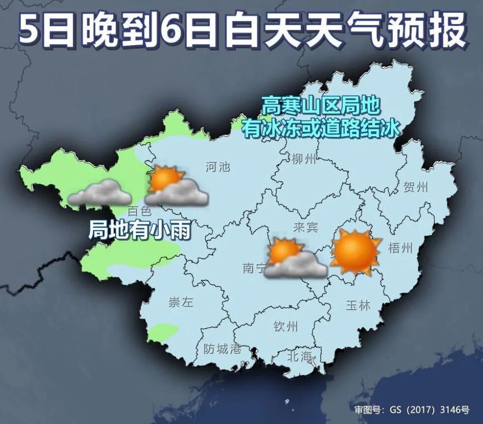 5日晚上到6日白天,全区多云到晴,其中桂西北阴天到多云、局地有小雨。高寒山区局地有冰冻或道路结冰。最低气温:高寒山区-4~2℃,桂东北2~7℃,其它地区7~12℃。