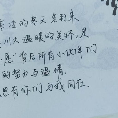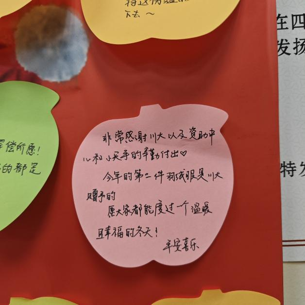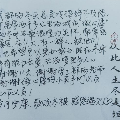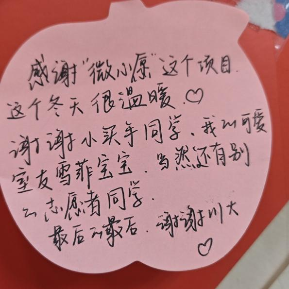 是进入川大的第三年,也是收到心愿礼物的第三个冬天,川大用独特的方式温暖每一个许下心愿的同学。前路也许漫长,但一个个被实现的微心愿让我知道,总有人在温暖和支持着我们。而被温暖的人,也总会在某一天成为那个温暖别人的人。
