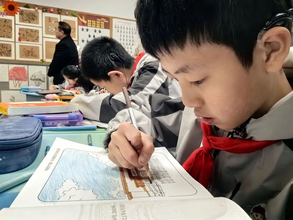 当天下午的教室里,只有画笔划过纸面的沙沙声,和偶尔用手语交流的轻柔动作,却令人格外触动。孩子们在涂色时展现出了不同的个性与思考。有的严谨地参照图片“还原历史”,有人则放飞想象,为建筑点缀上自己心中的色彩。一幅幅作品呈现出的,是党史学习的成果,更是孩子们情感与审美的表达。