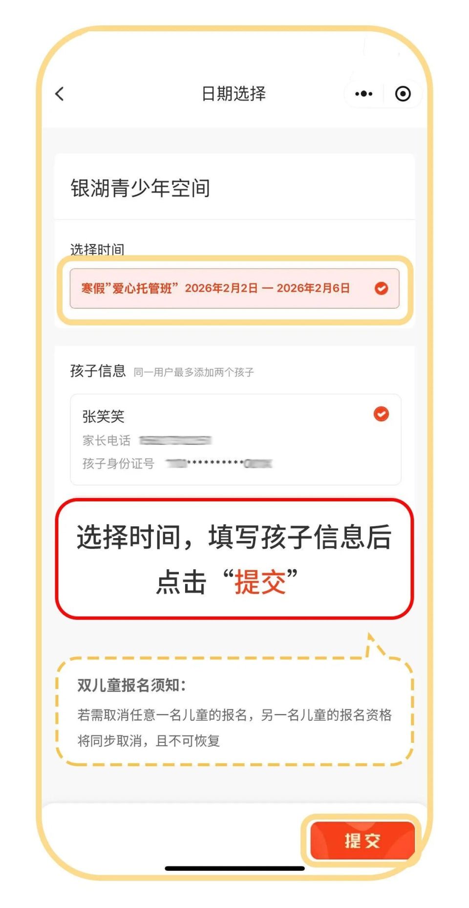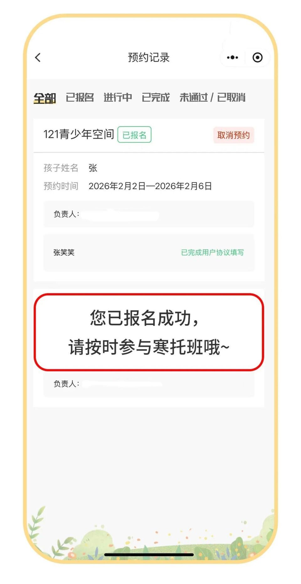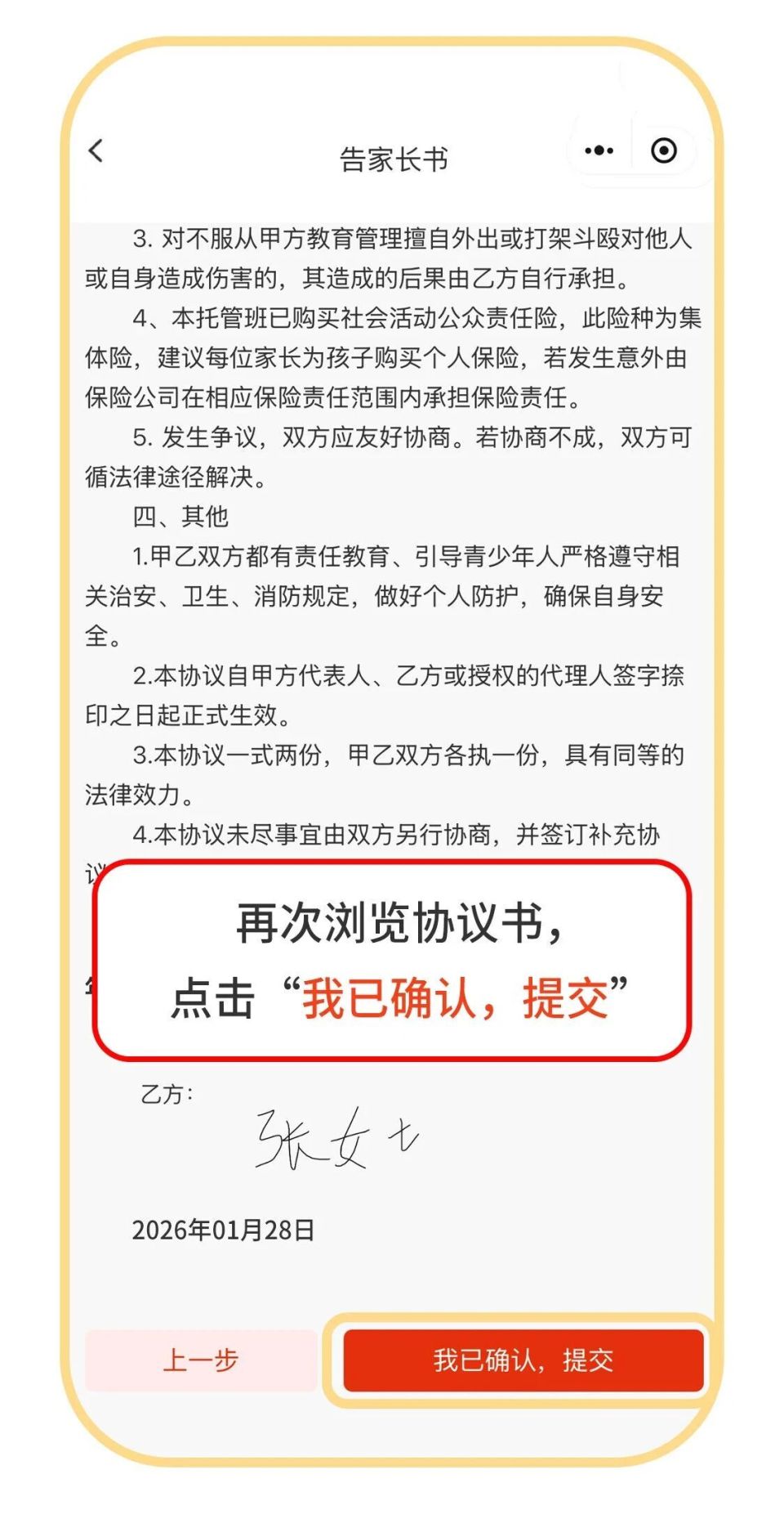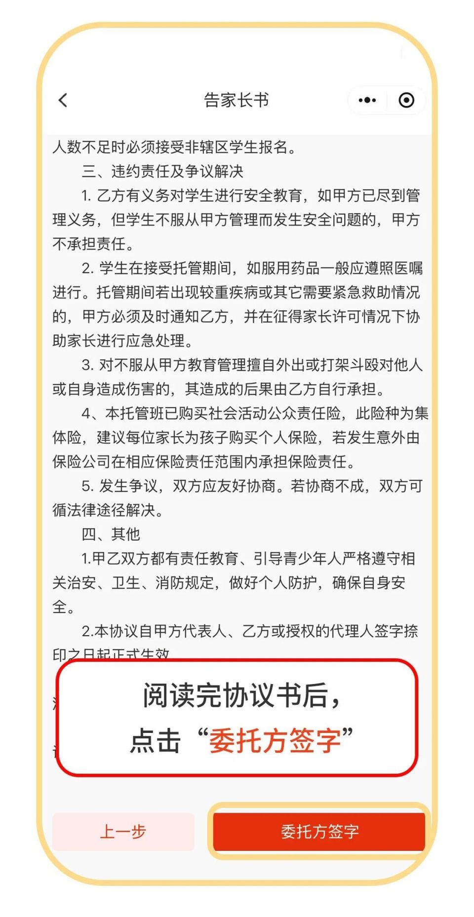 完成报名程序、托管班审核通过、家长线上签约后,按托管班开放时间正式报到。