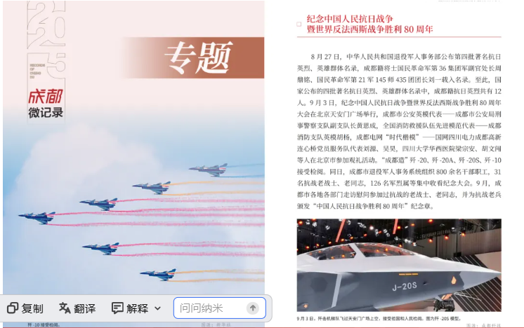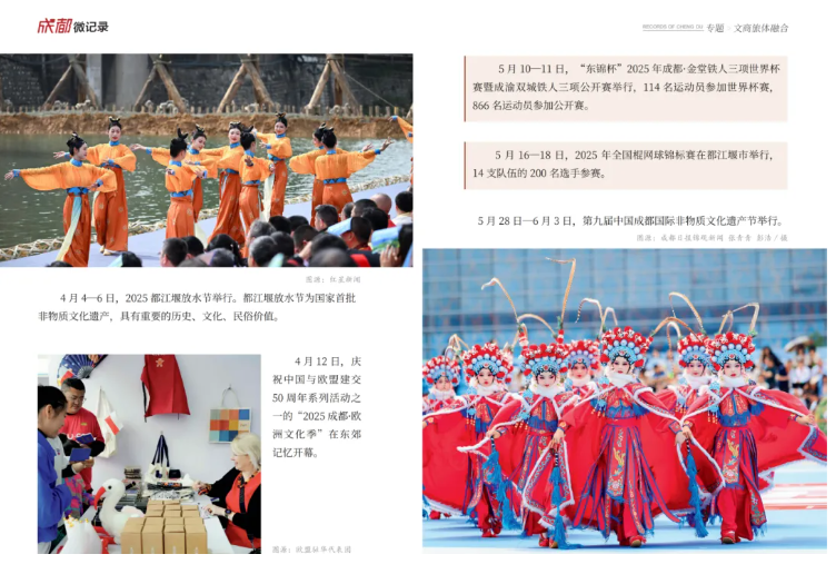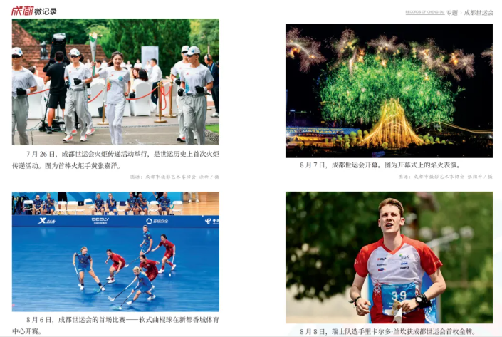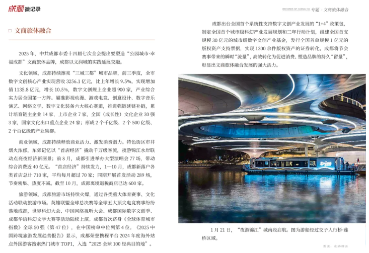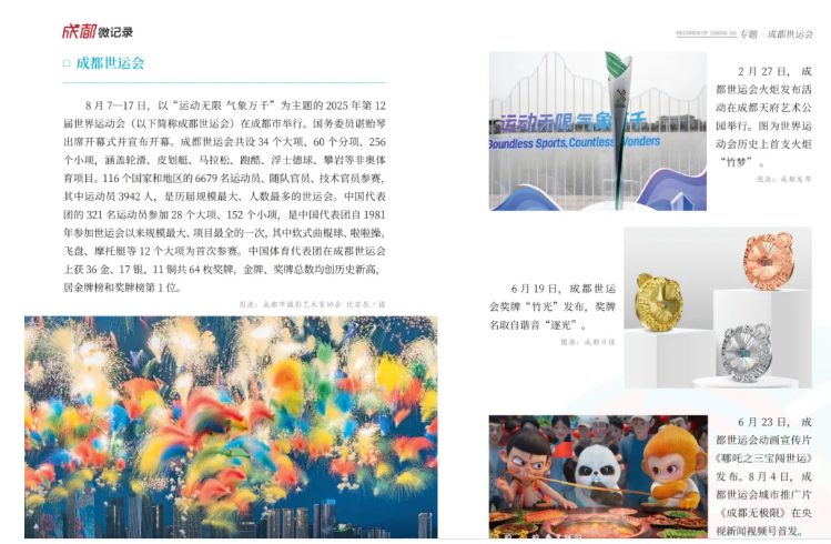 专题板块藏着城市的温度与力量。2025年,纪念中国人民抗日战争暨世界反法西斯战争胜利80周年大会在北京举行,12位成都籍英烈入选著名抗日英烈名录,“成都造”歼击机梯队接受检阅,家国情怀融入城市血脉;文商旅体深度融合,“夜游锦江”城南段启航、双层观光巴士上线,全国游泳锦标赛、ATP250成都公开赛等赛事燃动全城,第九届中国成都国际非物质文化遗产节让市民尽享文旅盛宴;“成都造”持续突破,《哪吒之魔童闹海》跻身全球影史票房前五,“通天晓”等机器人惊艳亮相,生物医药领域多款创新药获批上市;低空经济全产业链成型,86个应用场景、107条载人载物航线让“低空+”赋能民生;第12届世界运动会成功举办,中国代表团斩获64枚奖牌居双榜首位,成都获赞“高质量办赛”代名词。此外,20余位市民合力抬车救人、高温天爱心冰箱送清凉等暖心事,让城市微光汇聚成炬。