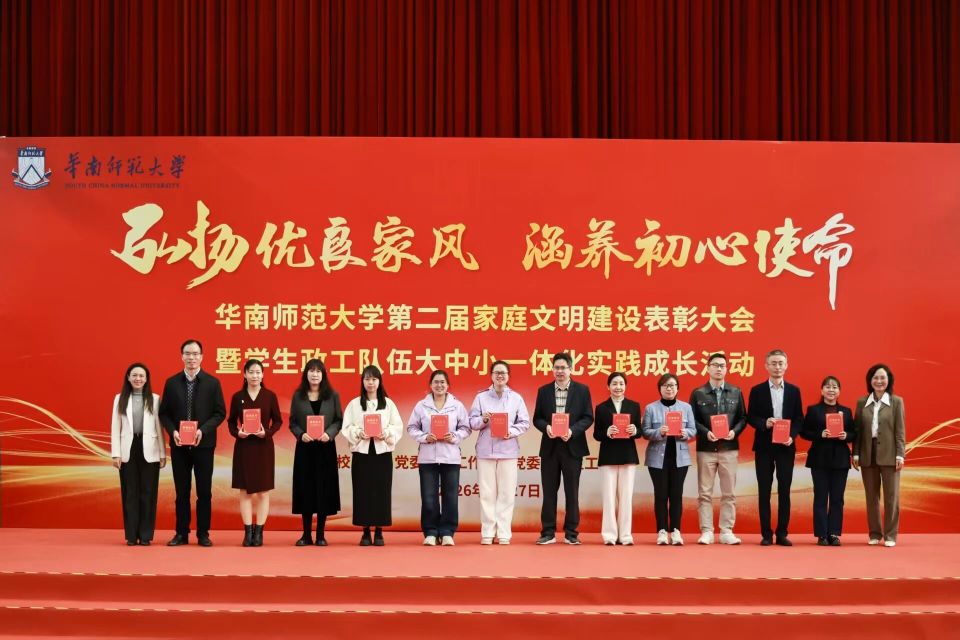 1月27日,华师第二届“弘扬优良家风,涵养初心使命”家庭文明建设表彰大会暨学生政工队伍大中小一体化实践成长活动在石牌校园手球馆举行。省教科文卫工会、学校相关职能部门及教学单位领导、51个“五好文明家庭”代表、政工队伍及教职工家属等近300人参加活动。