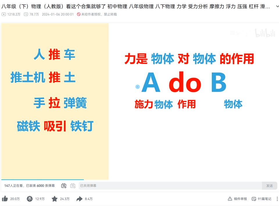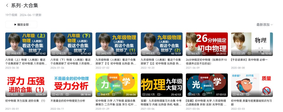 他的视频内容严格按照人教版物理教材,从八年级到九年级,从力学、电学到光学、热学,每一个知识点都有对应的视频讲解。