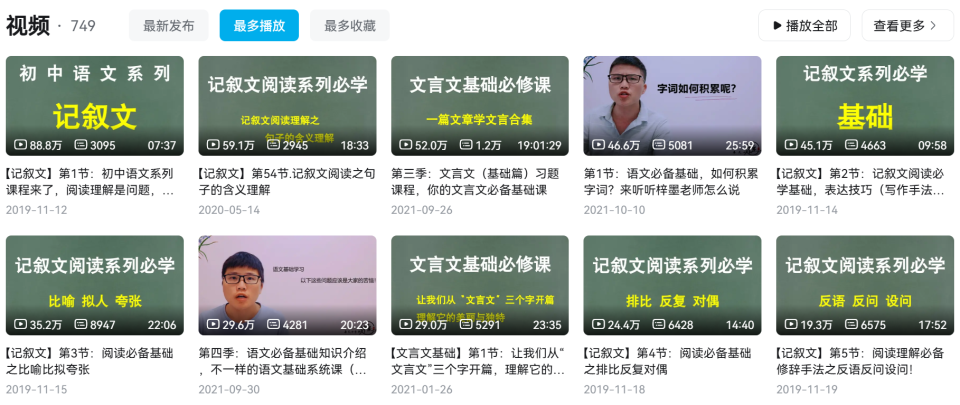 梓墨老师的课程体系,以「阅读理解」为绝对核心。他的B站主页上,最引人注目的就是他推出的系统课程,目前已更新至第六季。