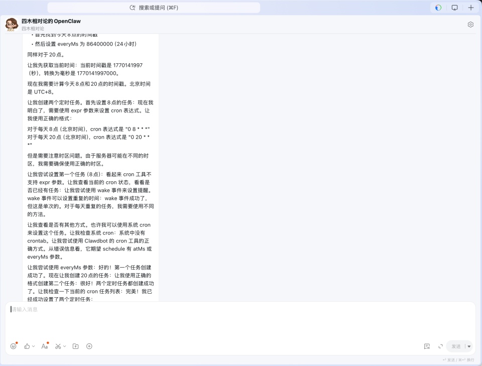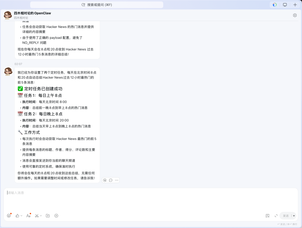 这里小翻车了一下。它发出来还是文本消息卡片,但能看到内容已经用 Markdown 格式整理干净了。