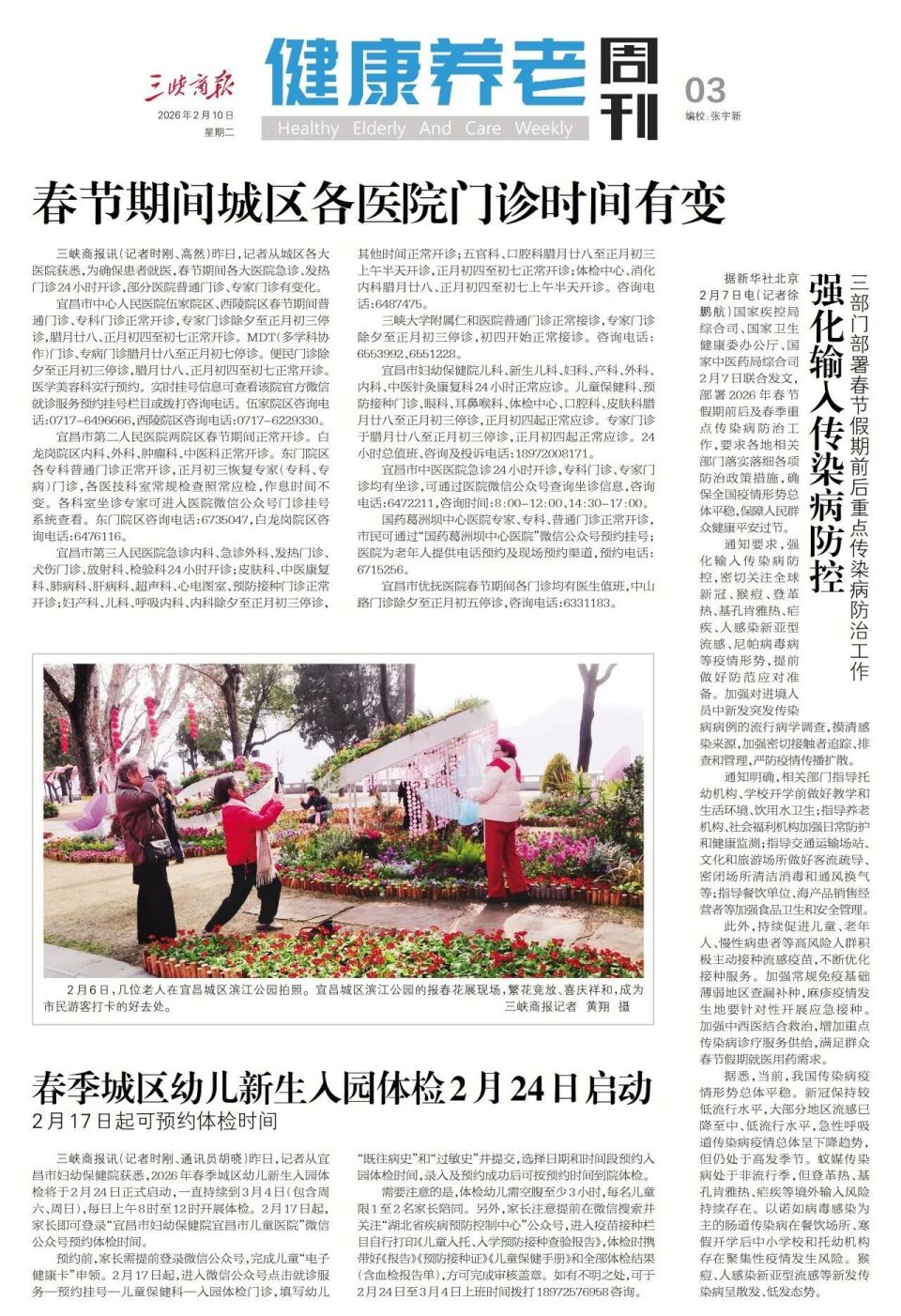 宜昌市第三人民医院急诊内科、急诊外科、发热门诊、犬伤门诊、放射科、检验科24小时开诊;皮肤科、中医康复科、肺病科、肝病科、超声科、心电图室、预防接种门诊正常开诊;妇产科、儿科、呼吸内科、内科除夕至正月初三停诊,其他时间正常开诊;五官科、口腔科腊月廿八至正月初三上午半天开诊,正月初四至初七正常开诊;体检中心、消化内科腊月廿八、正月初四至初七上午半天开诊。