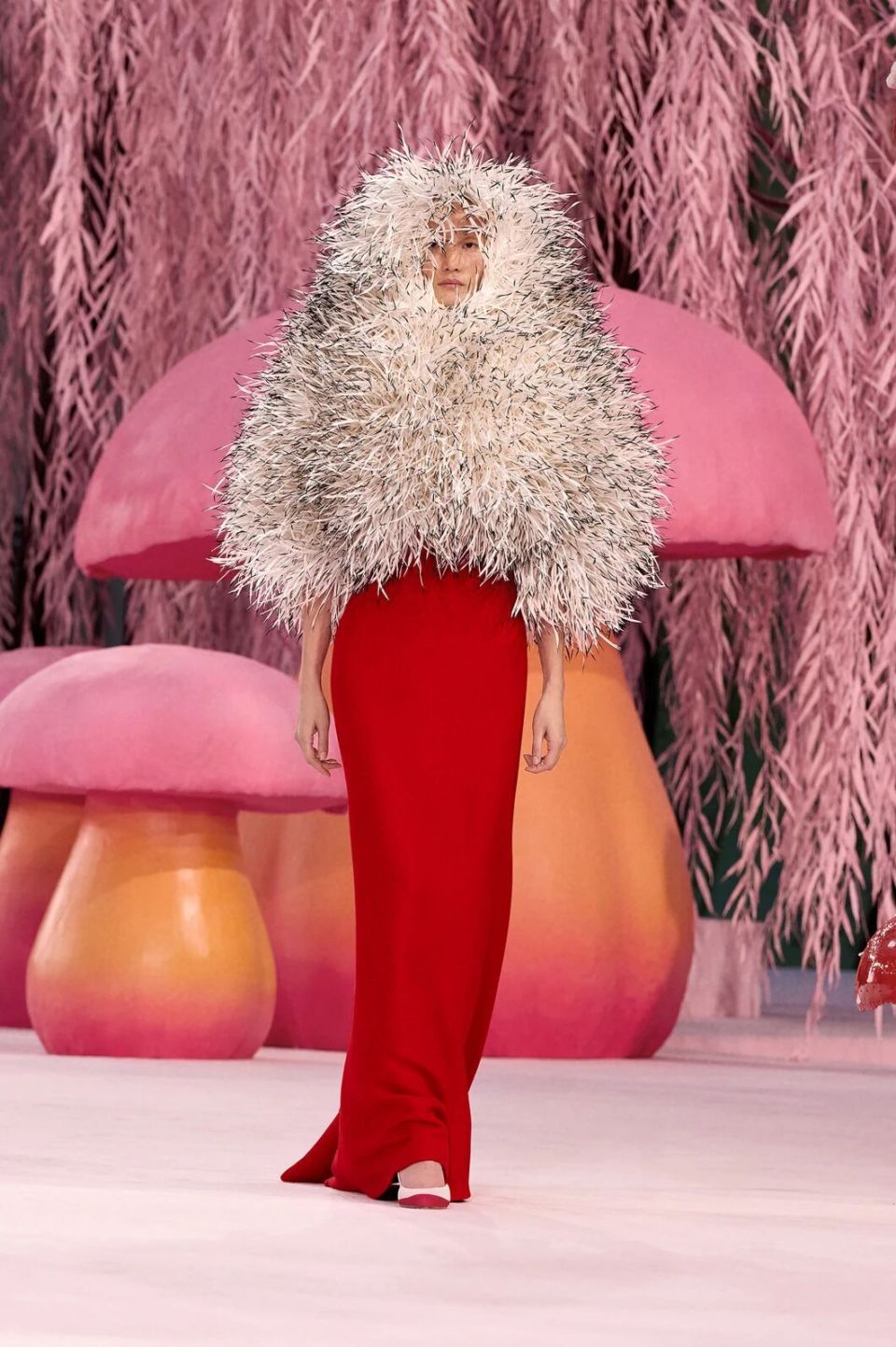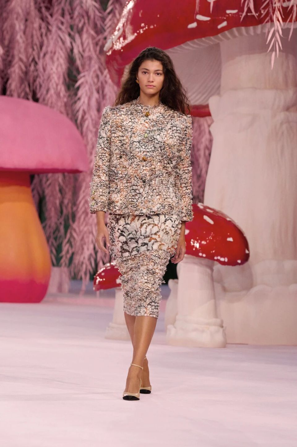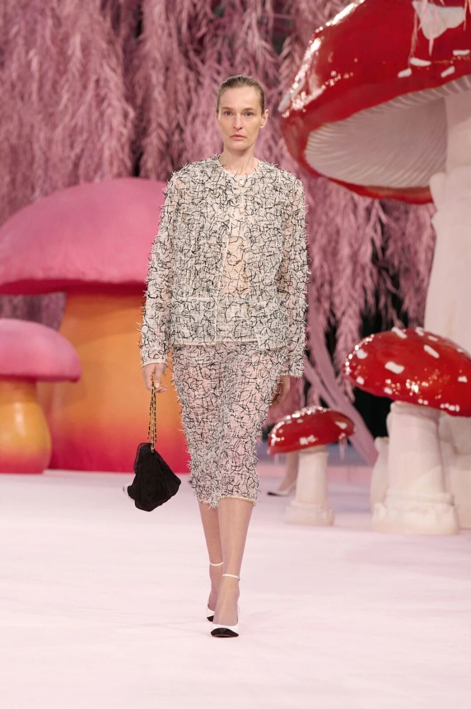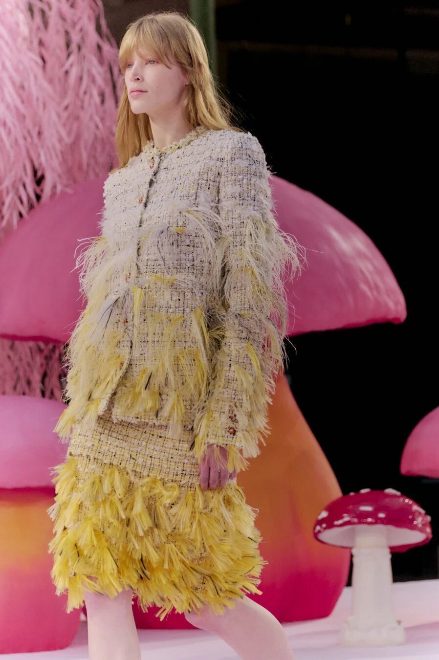 当然,Matthieu Blazy的刀锋藏在感性与诗意之下。他把秀场打造成为了一座粉色森林,淡粉色的柳条,巨大的彩色菌菇,身着CHANEL的女人们就是穿行在这浪漫时空的鸟儿,CHANEL高级定制就是它们的羽毛。