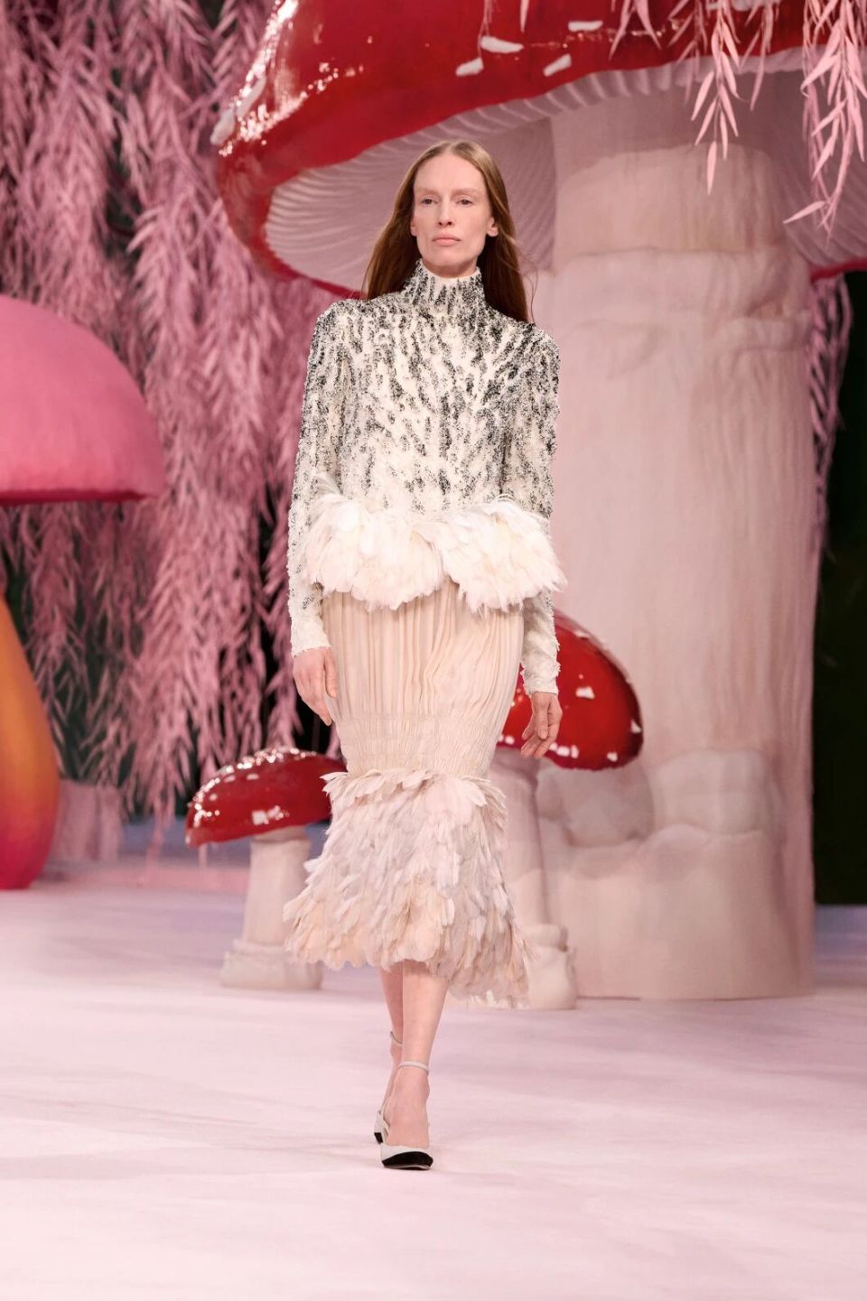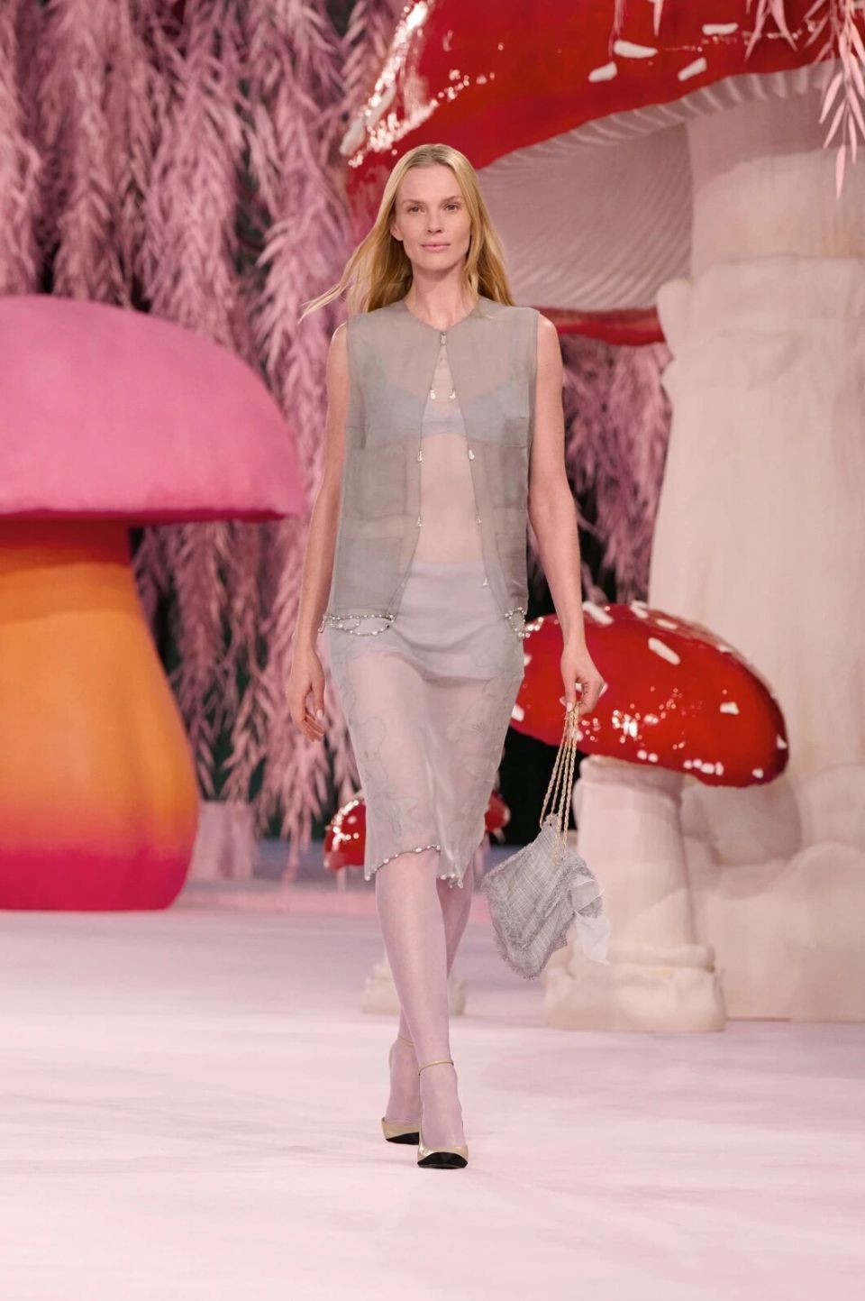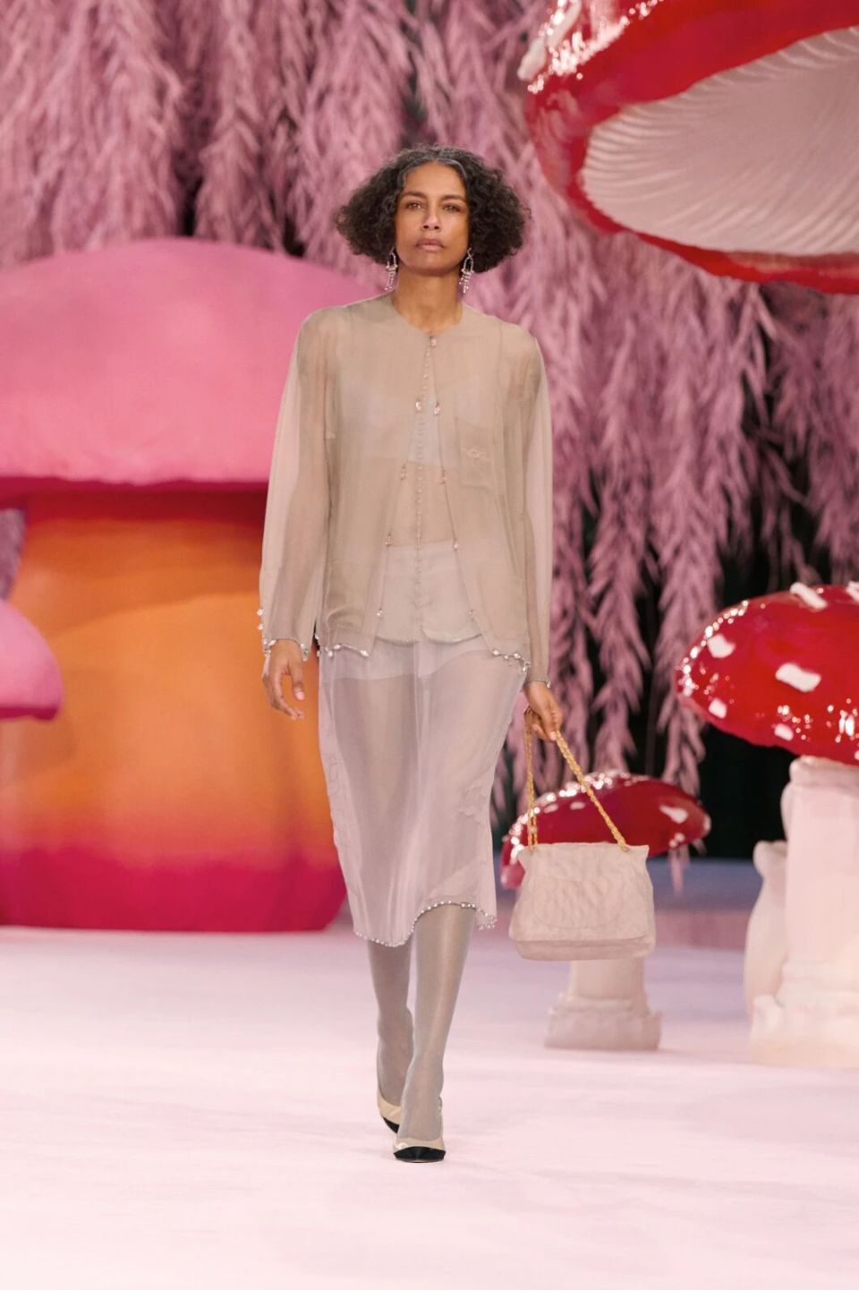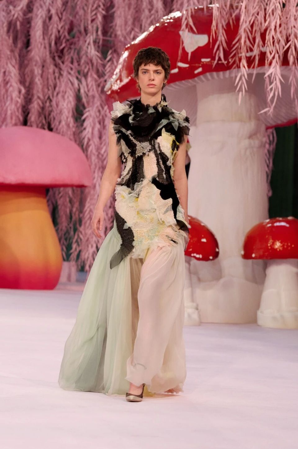 当然,Matthieu Blazy的刀锋藏在感性与诗意之下。他把秀场打造成为了一座粉色森林,淡粉色的柳条,巨大的彩色菌菇,身着CHANEL的女人们就是穿行在这浪漫时空的鸟儿,CHANEL高级定制就是它们的羽毛。