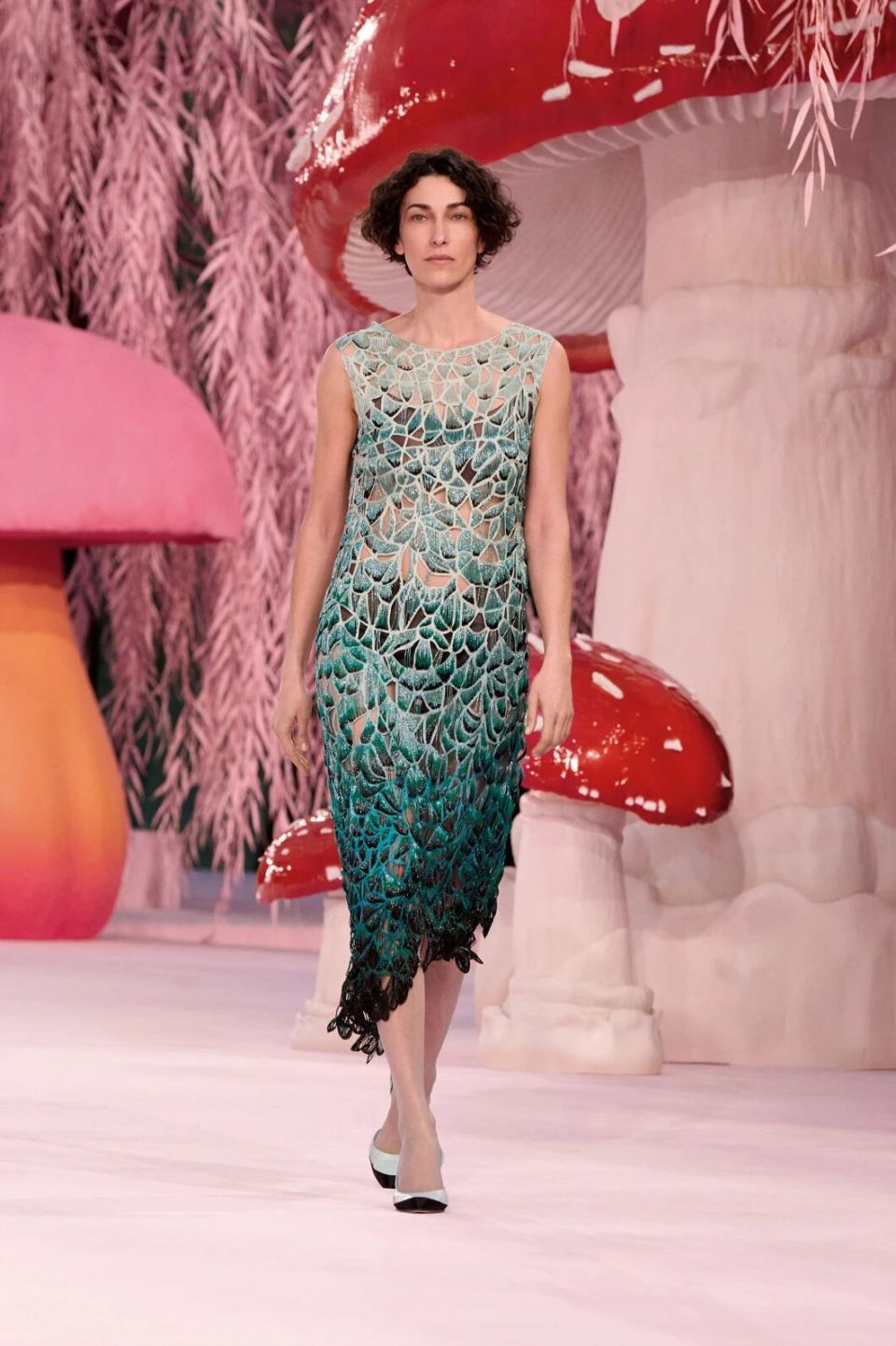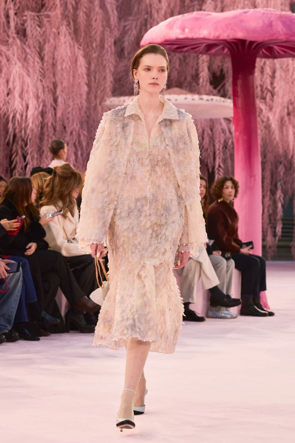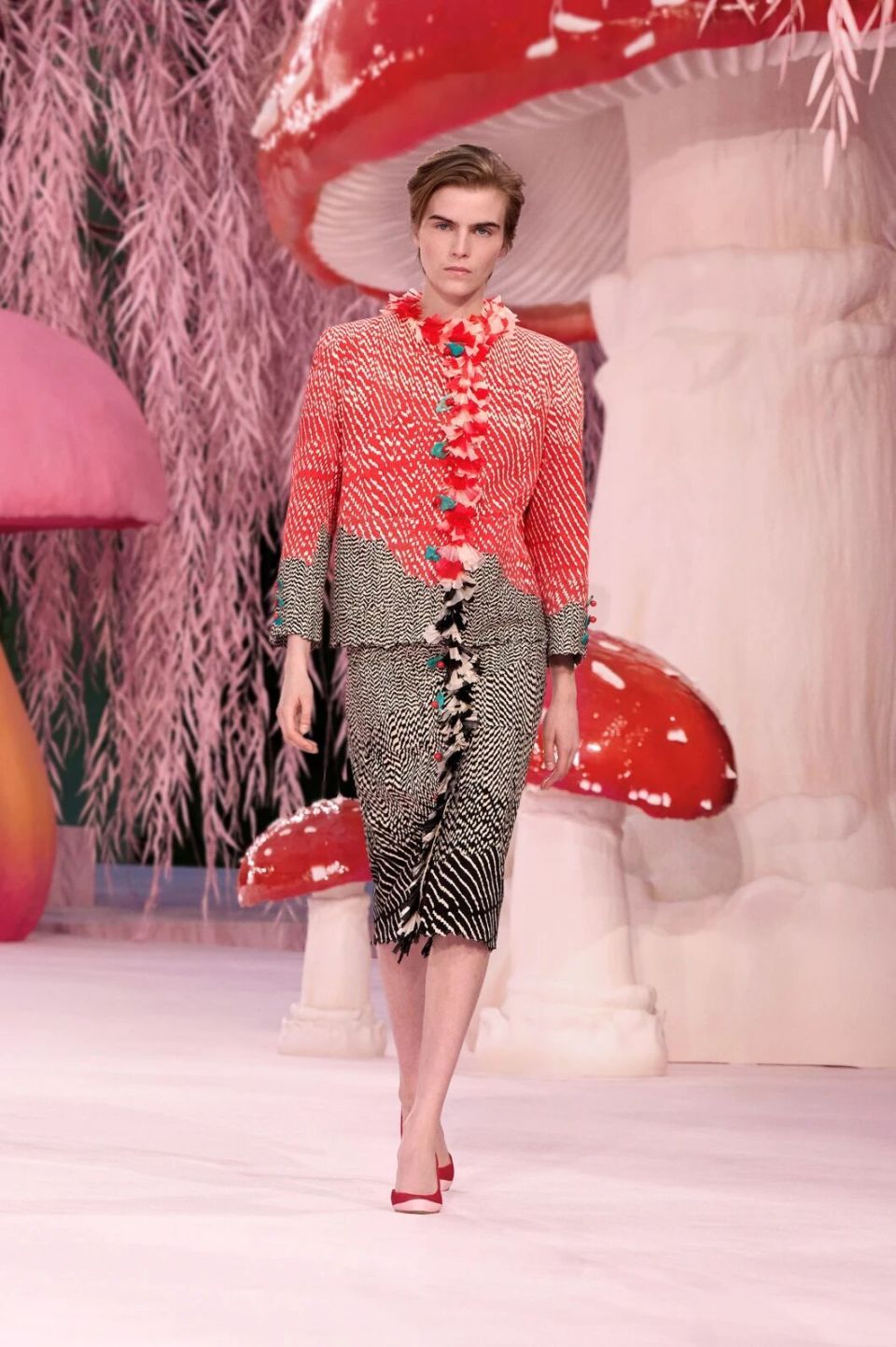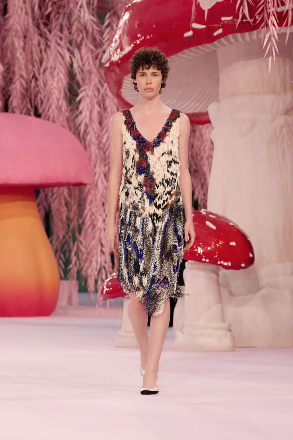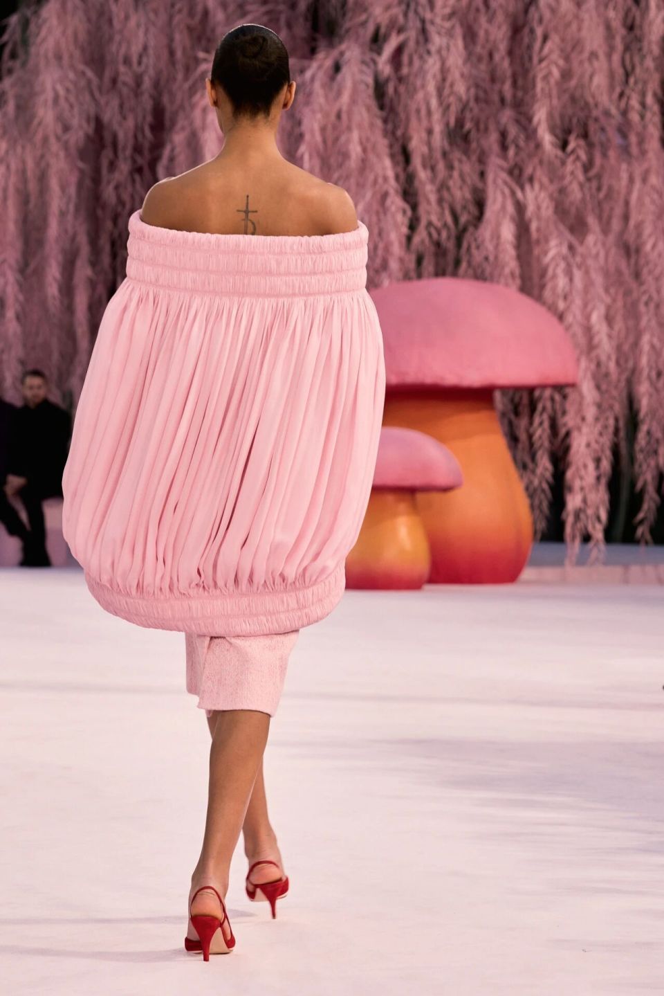 当然,Matthieu Blazy的刀锋藏在感性与诗意之下。他把秀场打造成为了一座粉色森林,淡粉色的柳条,巨大的彩色菌菇,身着CHANEL的女人们就是穿行在这浪漫时空的鸟儿,CHANEL高级定制就是它们的羽毛。