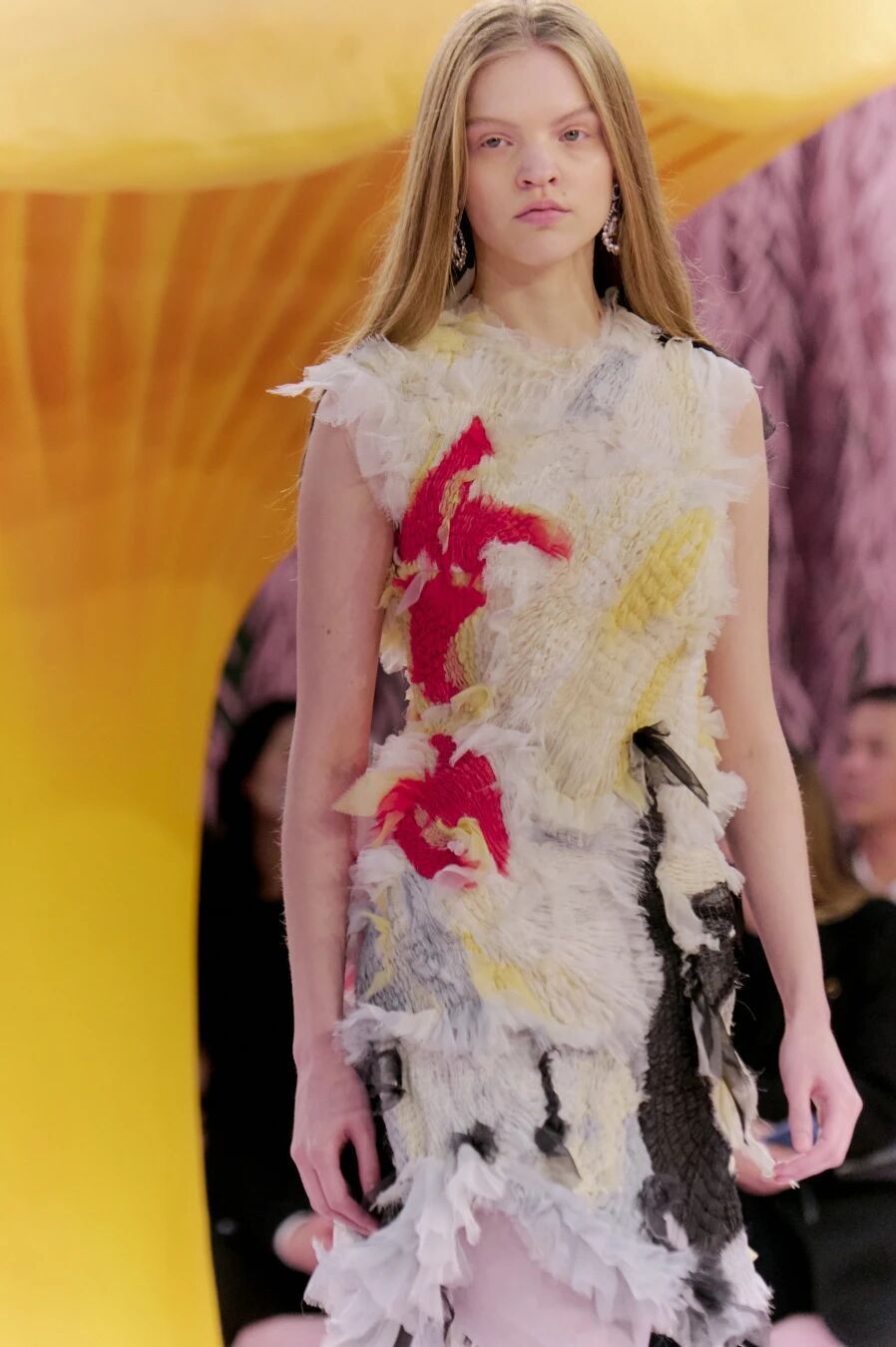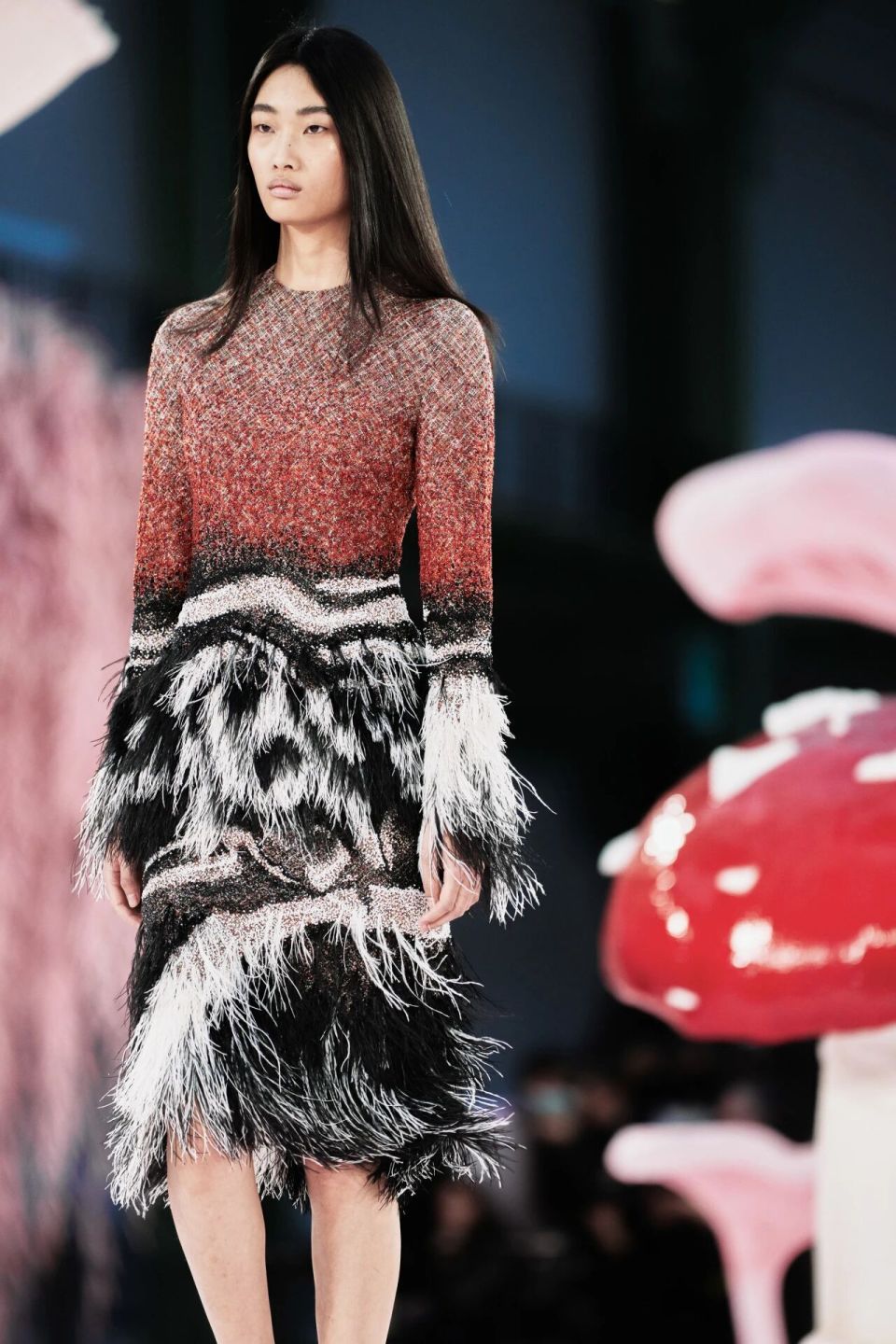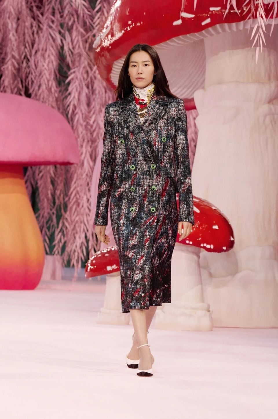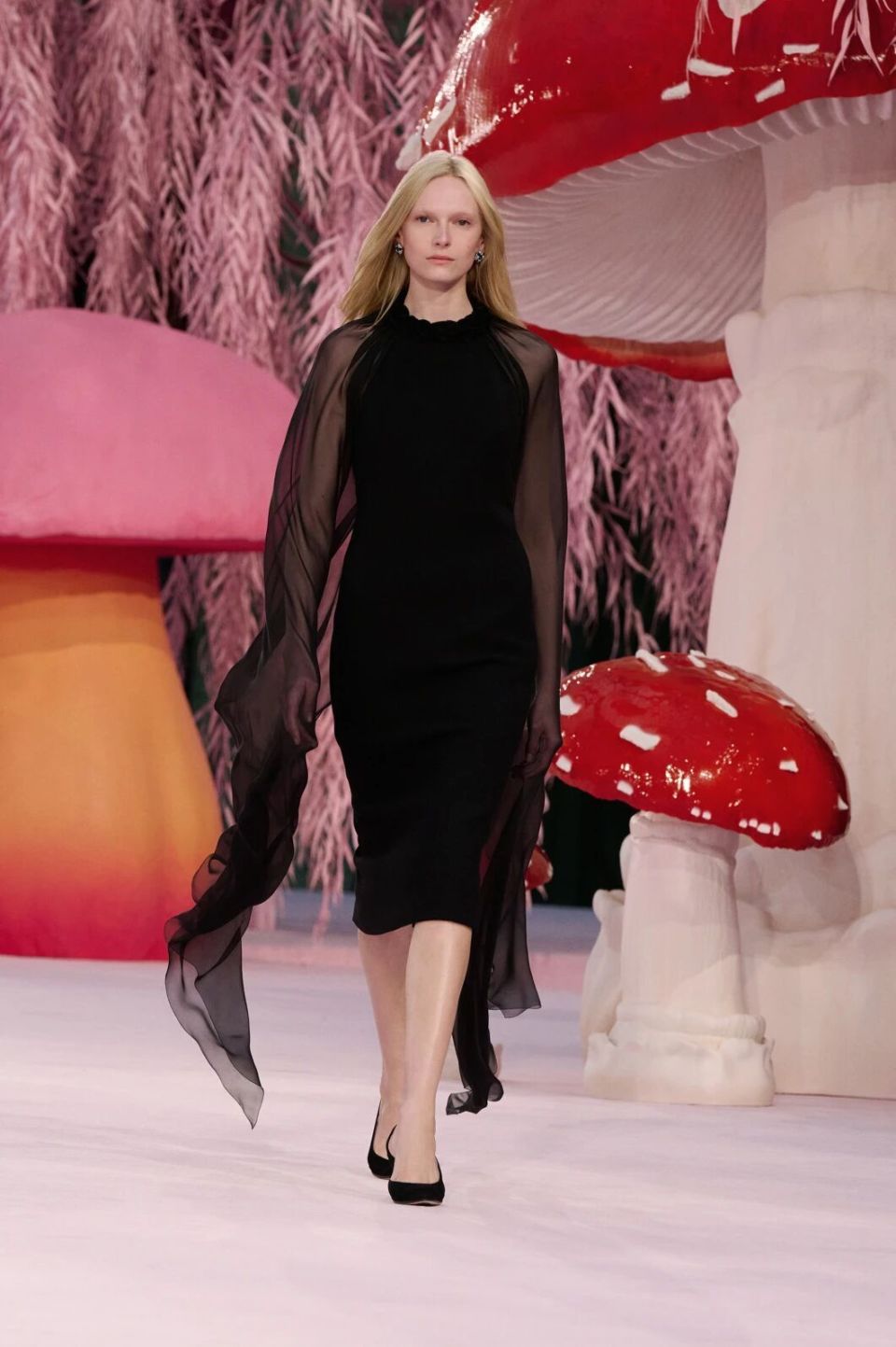 当然,Matthieu Blazy的刀锋藏在感性与诗意之下。他把秀场打造成为了一座粉色森林,淡粉色的柳条,巨大的彩色菌菇,身着CHANEL的女人们就是穿行在这浪漫时空的鸟儿,CHANEL高级定制就是它们的羽毛。