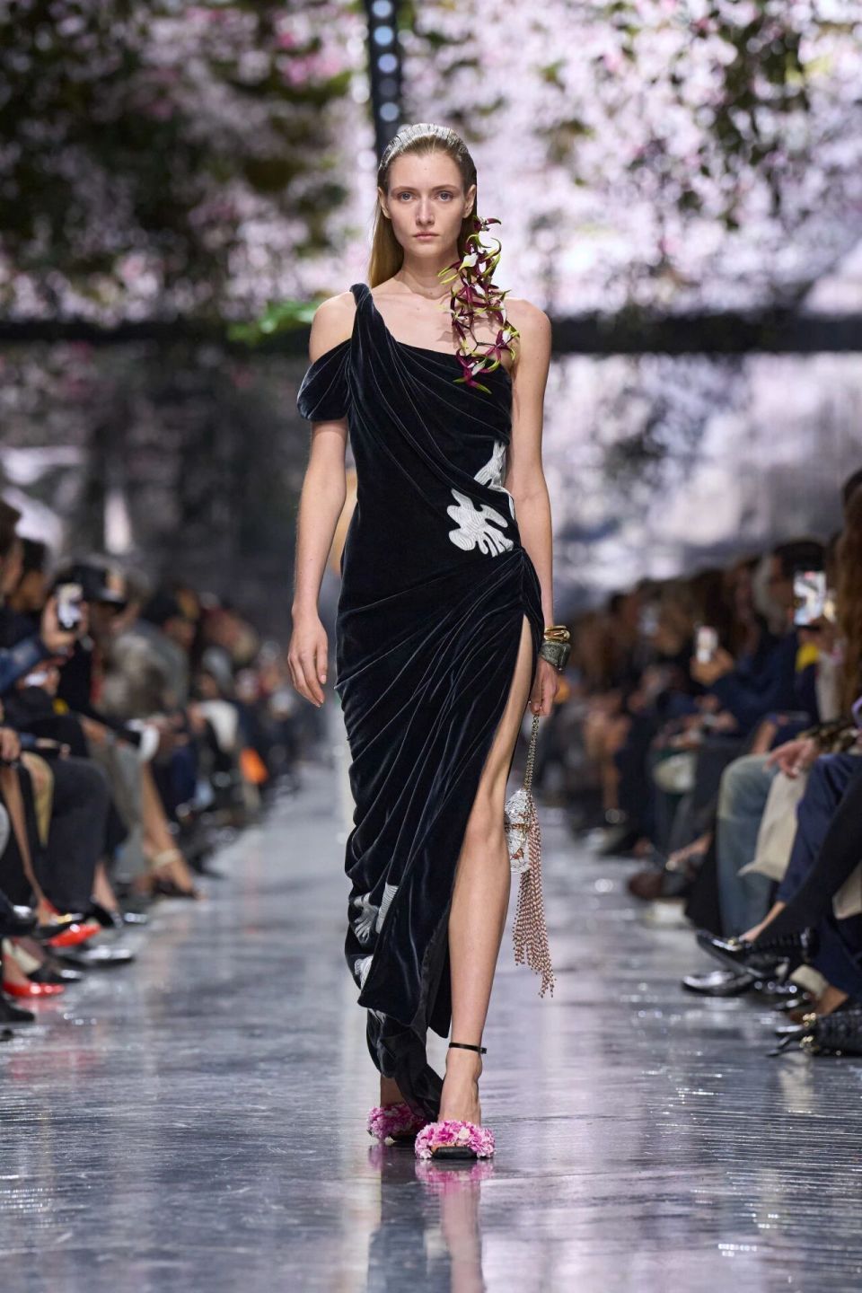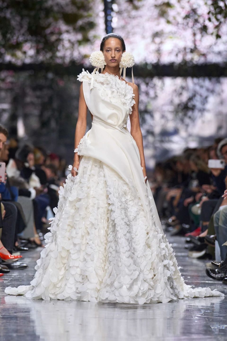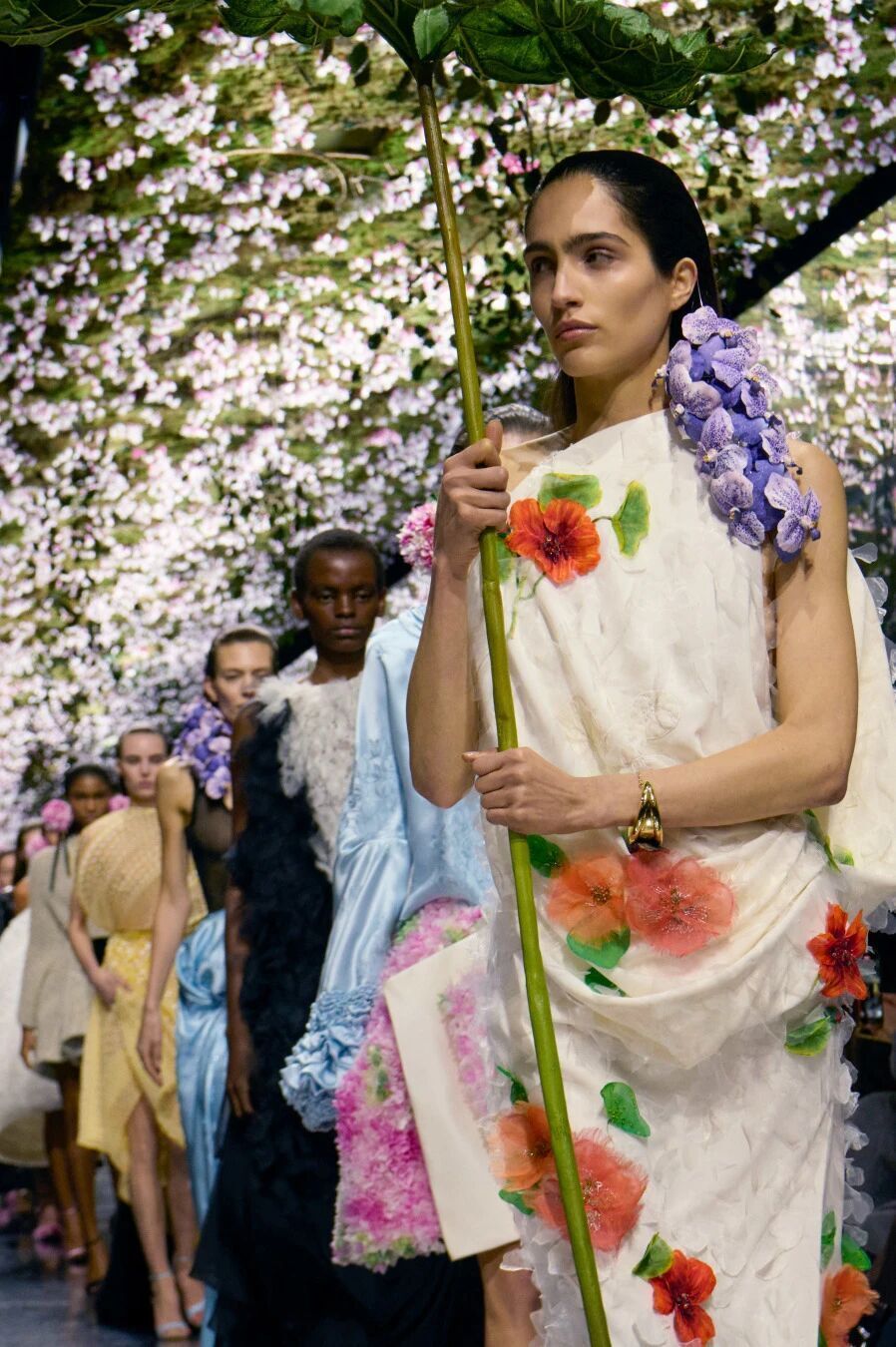 在这场高级订制秀上,那些仙客来从装饰天花板的苔藓中探出头,化作仿真花束装饰在模特的耳畔,是Jonathan Anderson对Galliano的致敬。