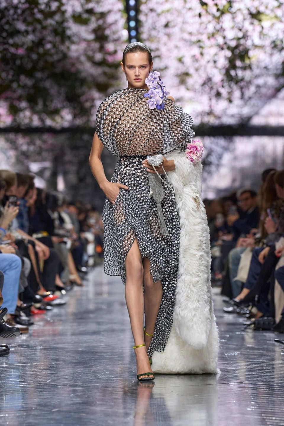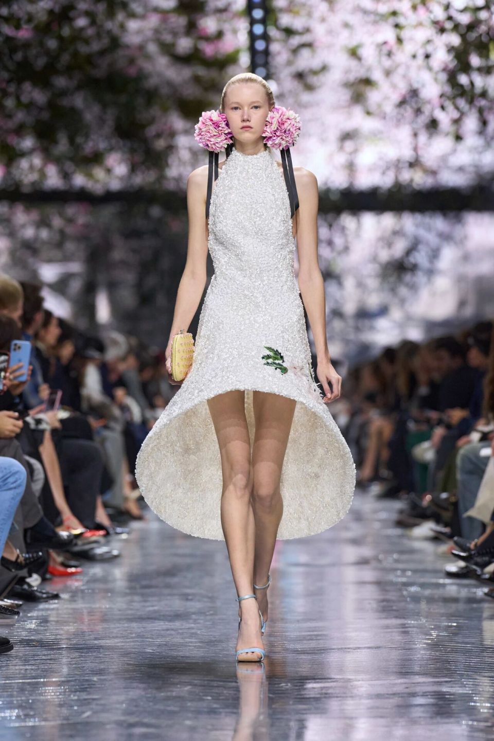 John Galliano就坐在秀场前排,这场秀上贯穿始终的仙客来就是对他的致敬。当Jonathan Anderson宣布入主Dior一职后,Galliano来看他,带着一束从后院采摘的仙客来。